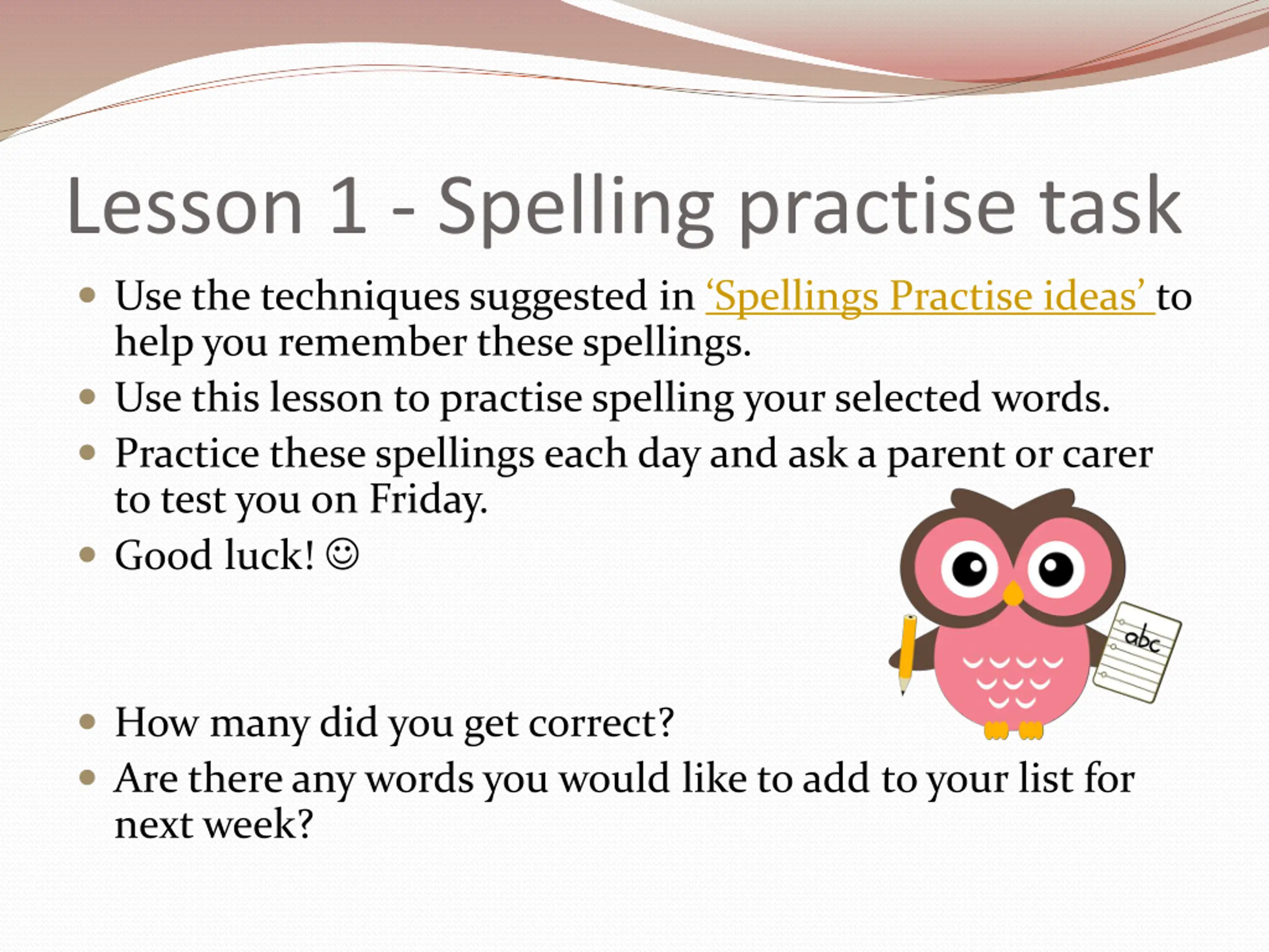 Lesson 1 - Spelling practise task Use the techniques suggested in Spellings Practise ideas to help you remember these spellings. Use this lesson to practise spelling your selected words. Practice these spellings each day and ask a parent or carer to test you on Friday. Good luck! How many did you get correct? Are there any words you would like to add to your list for next week?