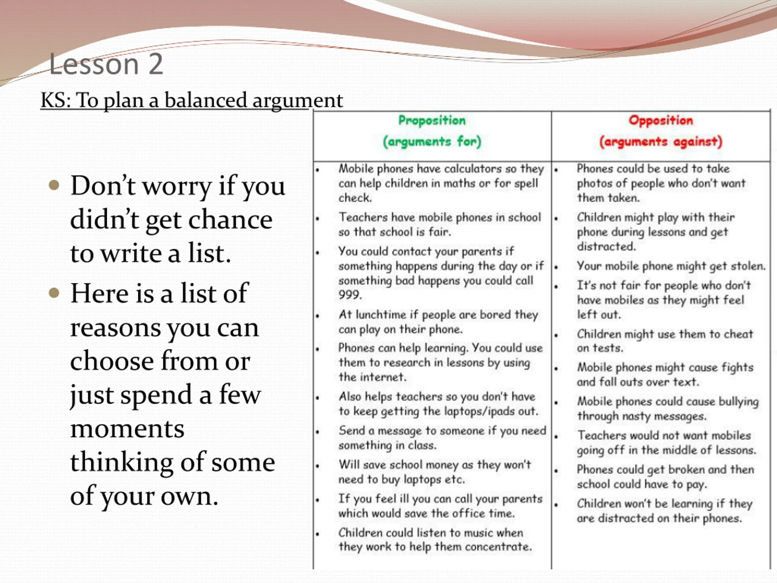 Lesson 2 KS: To plan a balanced argument Don t worry if you didn t get chance to write a list. Here is a list of reasons you can choose from or just spend a few moments thinking of some of your own.