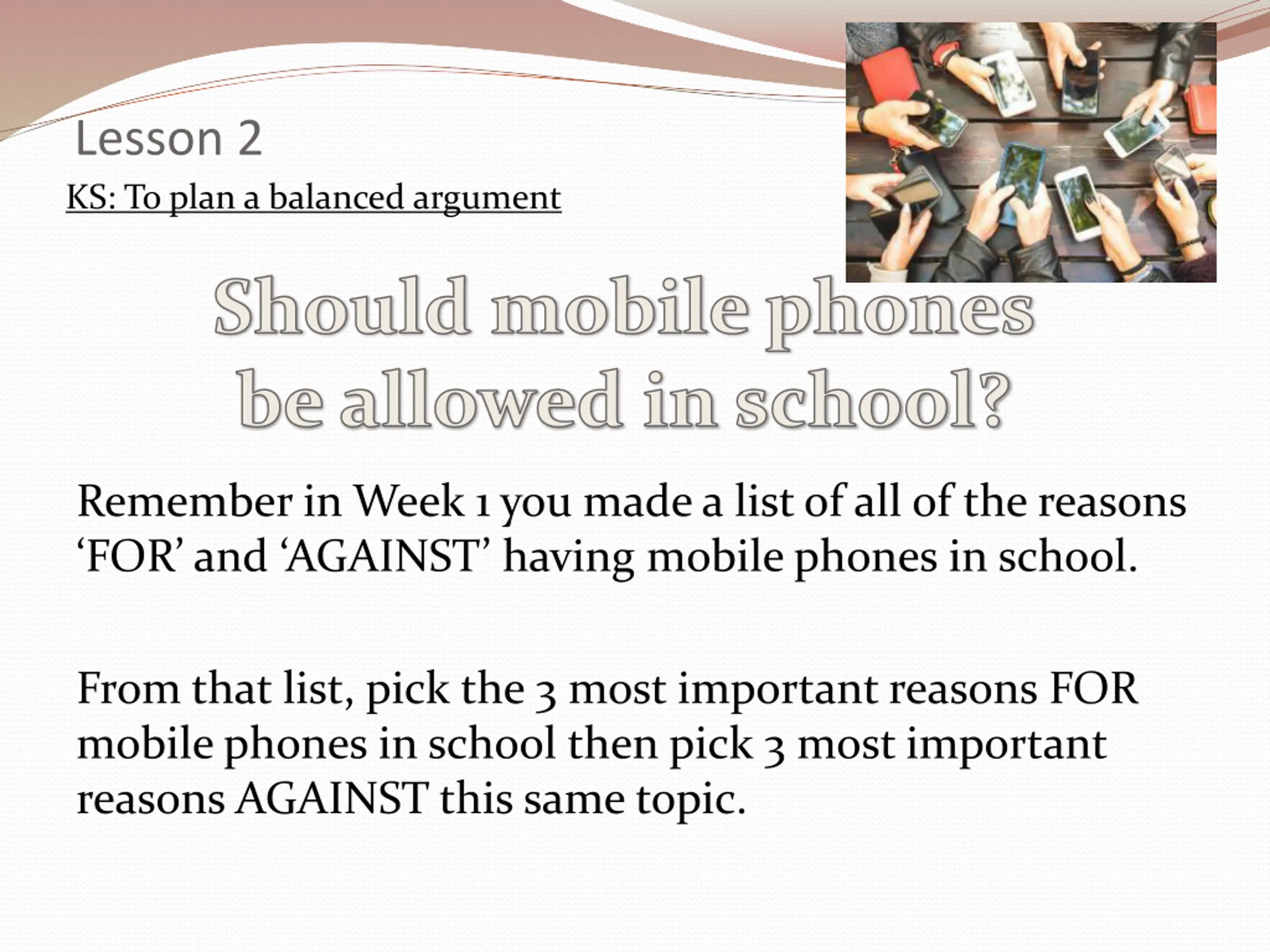 Lesson 2 KS: To plan a balanced argument Should mobile phones be allowed in school? Remember in Week 1 you made a list of all of the reasons FOR and AGAINST having mobile phones in school. From that list, pick the 3 most important reasons FOR mobile phones in school then pick 3 most important reasons AGAINST this same topic.