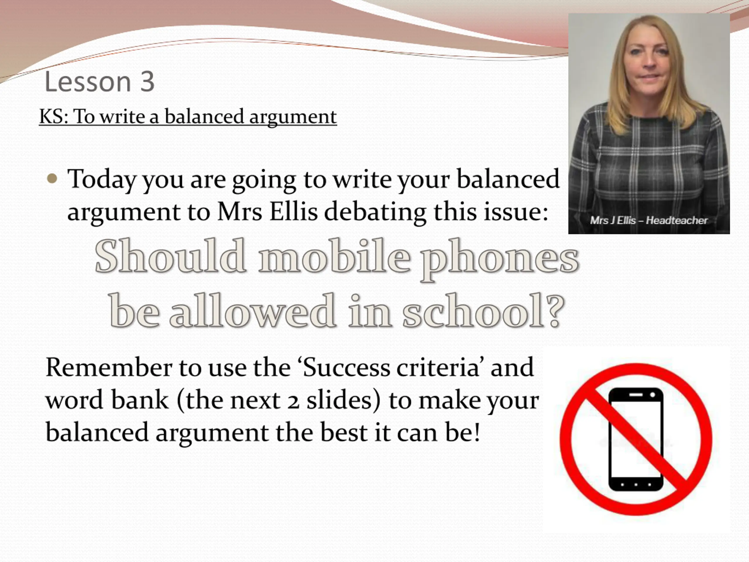 Lesson 3 KS: To write a balanced argument Today you are going to write your balanced argument to Mrs Ellis debating this issue: Should mobile phones be allowed in school? Remember to use the Success criteria and word bank (the next 2 slides) to make your balanced argument the best it can be!