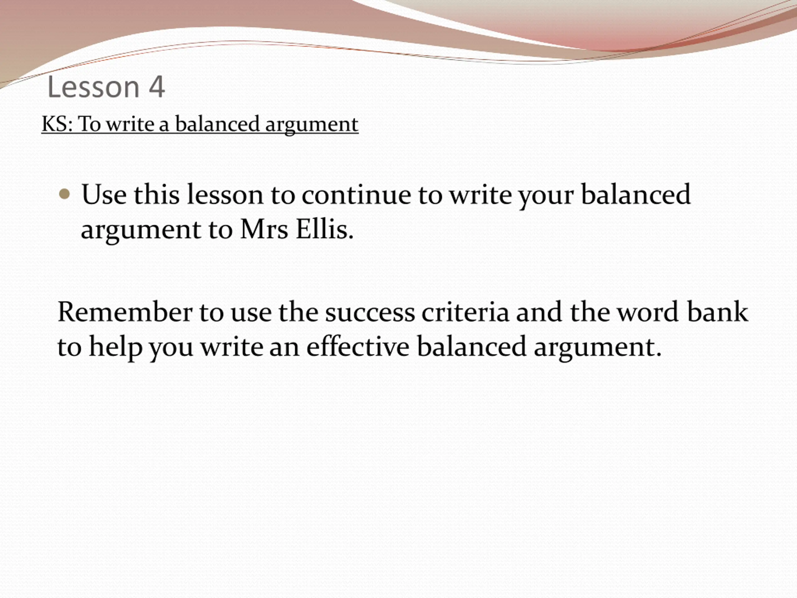 Lesson 4 KS: To write a balanced argument Use this lesson to continue to write your balanced argument to Mrs Ellis. Remember to use the success criteria and the word bank to help you write an effective balanced argument.