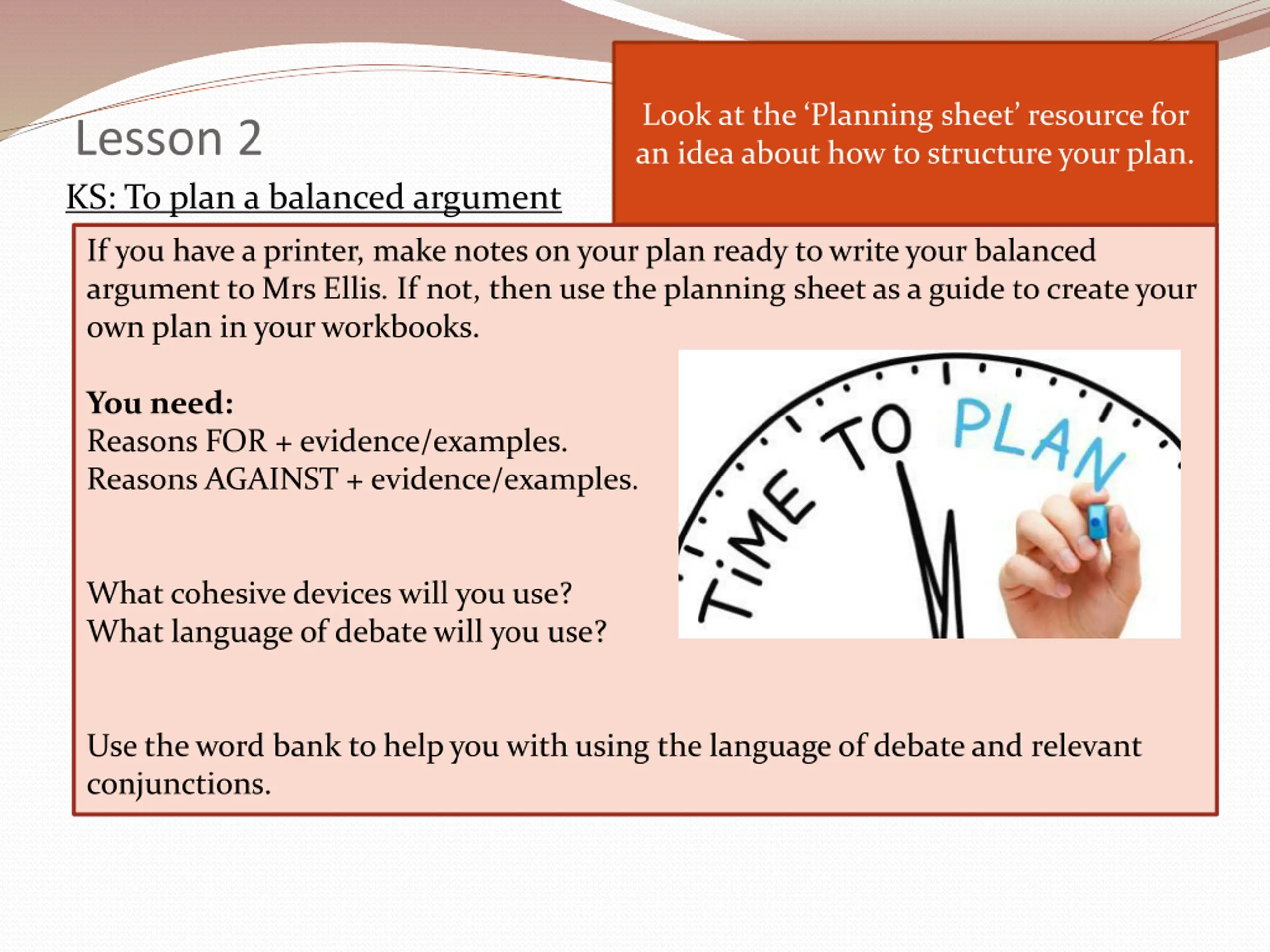 Look at the Planning sheet resource for an idea about how to structure your plan. Lesson 2 KS: To plan a balanced argument If you have a printer, make notes on your plan ready to write your balanced argument to Mrs Ellis. If not, then use the planning sheet as a guide to create your own plan in your workbooks. You need: Reasons FOR + evidence/examples. Reasons AGAINST + evidence/examples. What cohesive devices will you use? What language of debate will you use? Use the word bank to help you with using the language of debate and relevant conjunctions.
