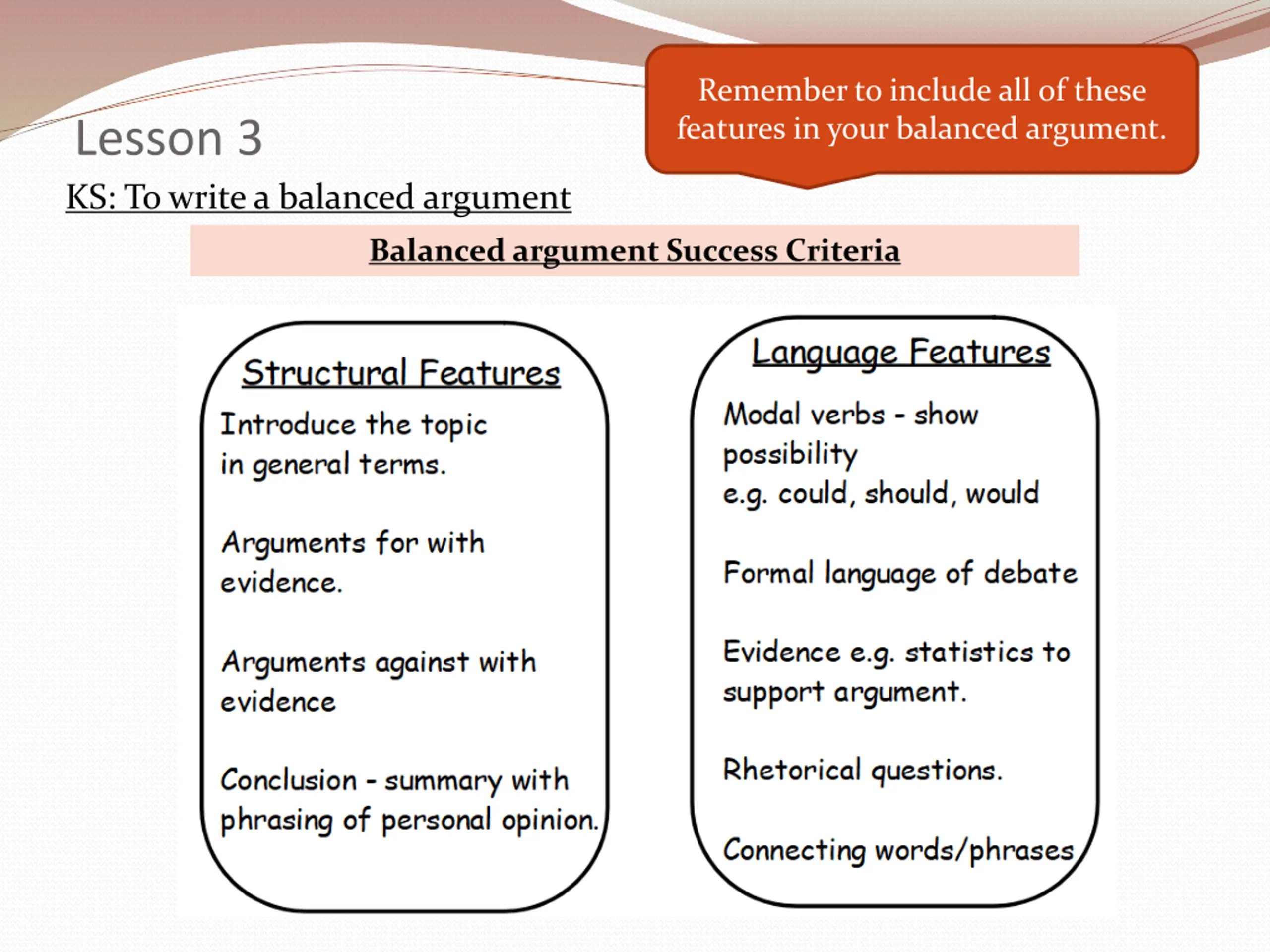 Remember to include all of these features in your balanced argument. Lesson 3 KS: To write a balanced argument Balanced argument Success Criteria