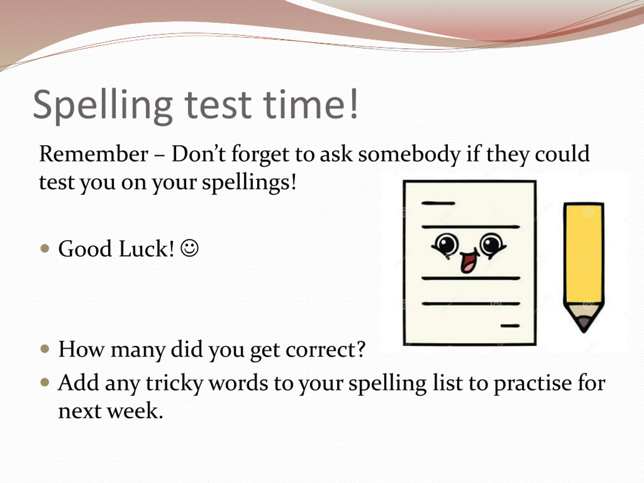 Spelling test time! Remember Don t forget to ask somebody if they could test you on your spellings! Good Luck! How many did you get correct? Add any tricky words to your spelling list to practise for next week.