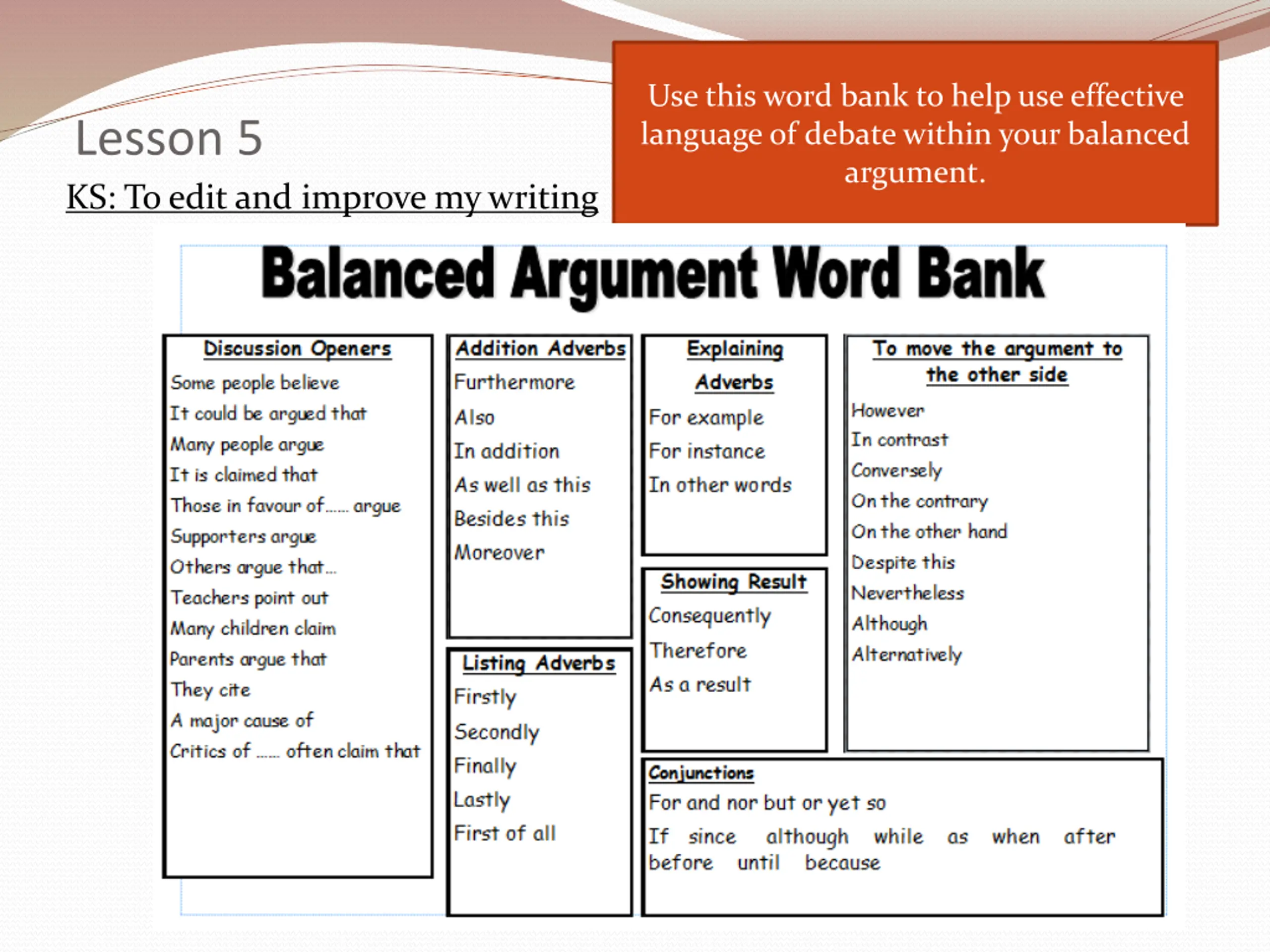 Use this word bank to help use effective language of debate within your balanced argument. Lesson 5 KS: To edit and improve my writing