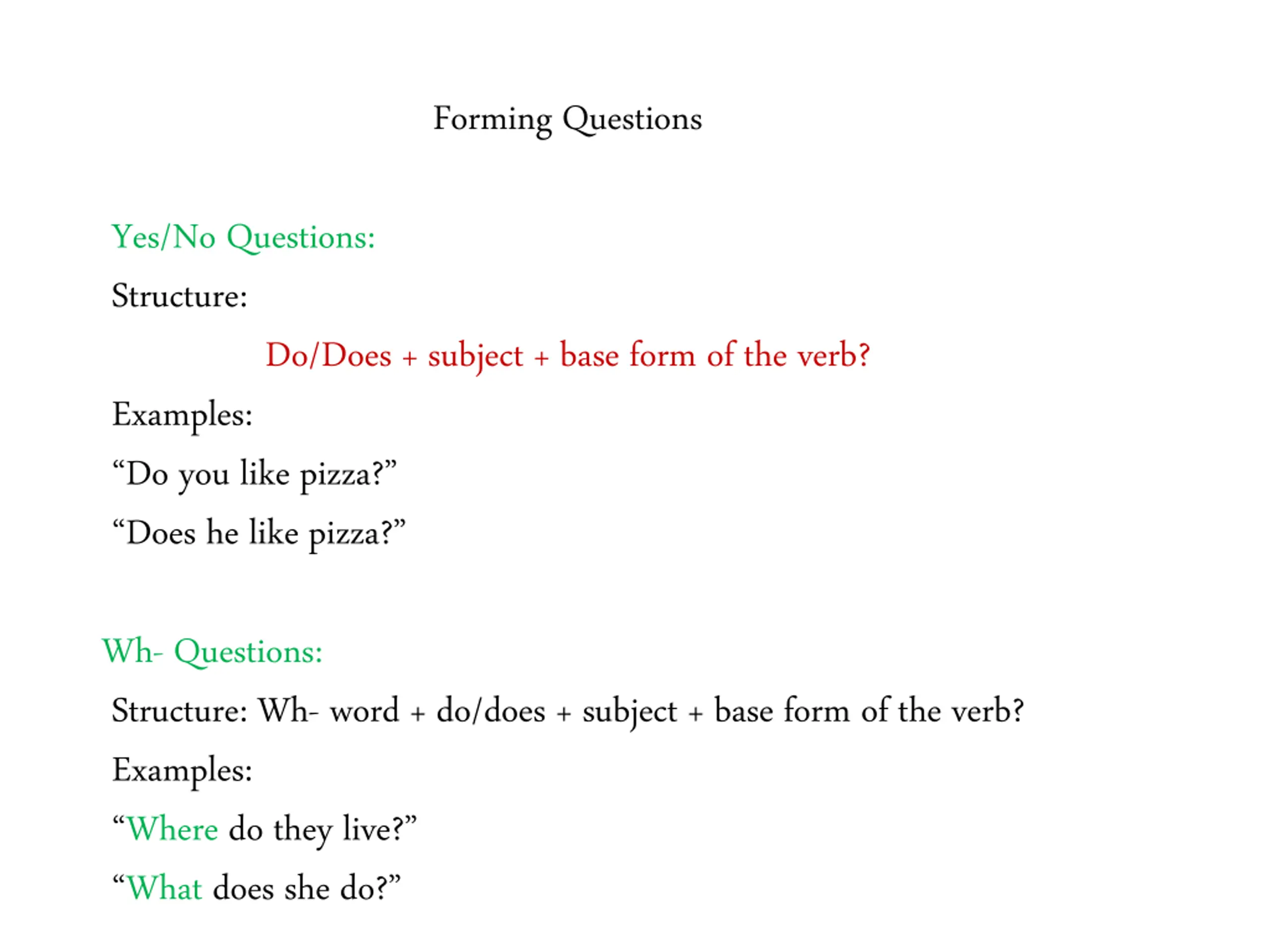 Forming Questions Yes/No Questions: Structure: Do/Does + subject + base form of the verb? Examples: Do you like pizza? Does he like pizza? Wh- Questions: Structure: Wh- word + do/does + subject + base form of the verb? Examples: Where do they live? What does she do?