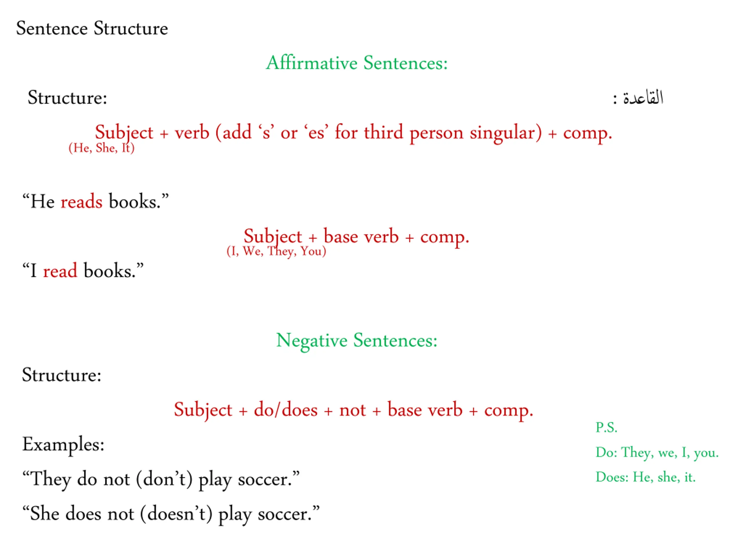 Sentence Structure Affirmative Sentences: Structure: Subject + verb (add s or es for third person singular) + comp. (He, She, It) : He reads books. Subject + base verb + comp. (I, We, They, You) I read books. Negative Sentences: Structure: Subject + do/does + not + base verb + comp. P.S. Do: They, we, I, you. Does: He, she, it. Examples: They do not (don t) play soccer. She does not (doesn t) play soccer.