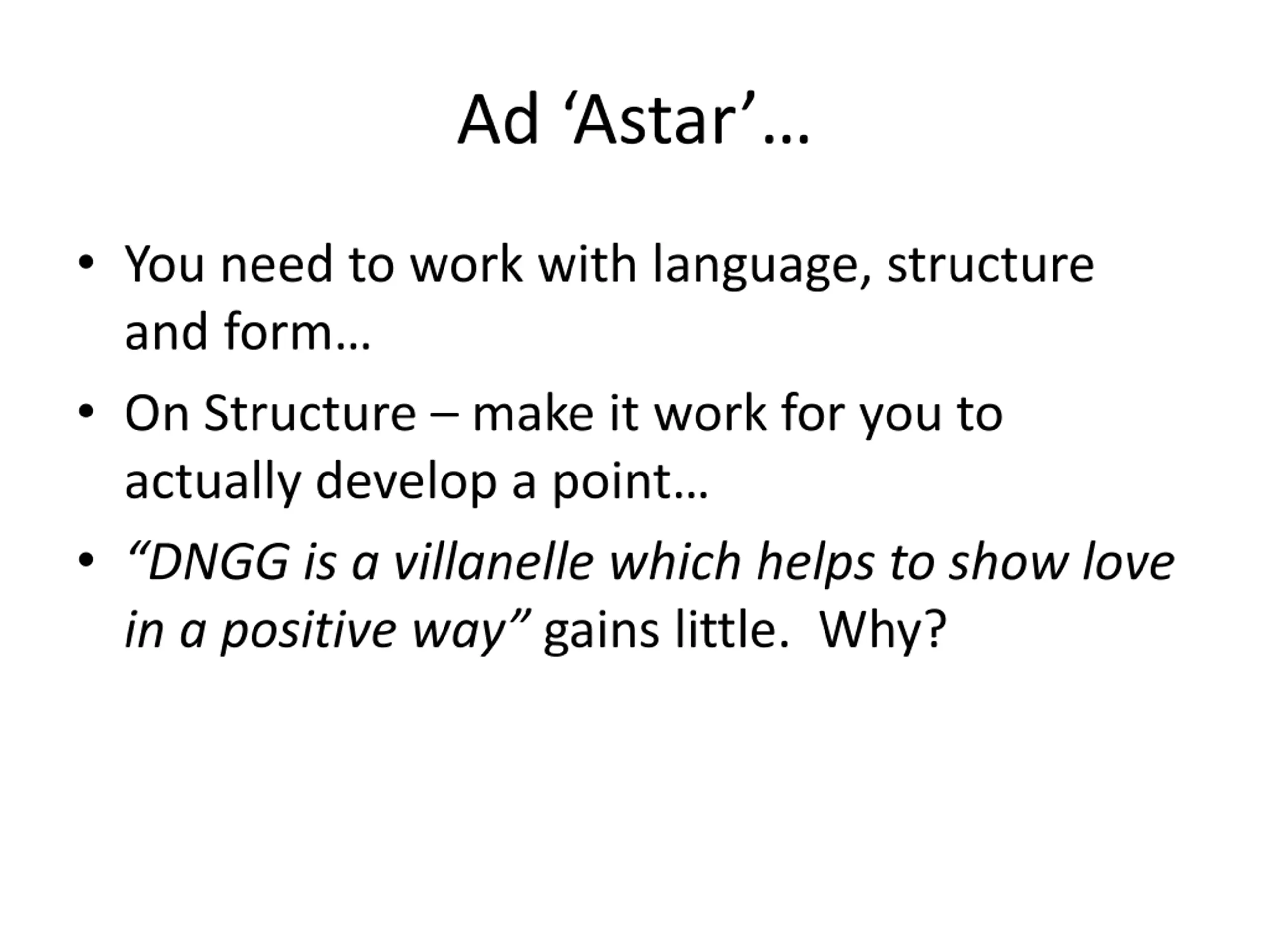 Ad Astar You need to work with language, structure and form On Structure make it work for you to actually develop a point DNGG is a villanelle which helps to show love in a positive way gains little. Why?