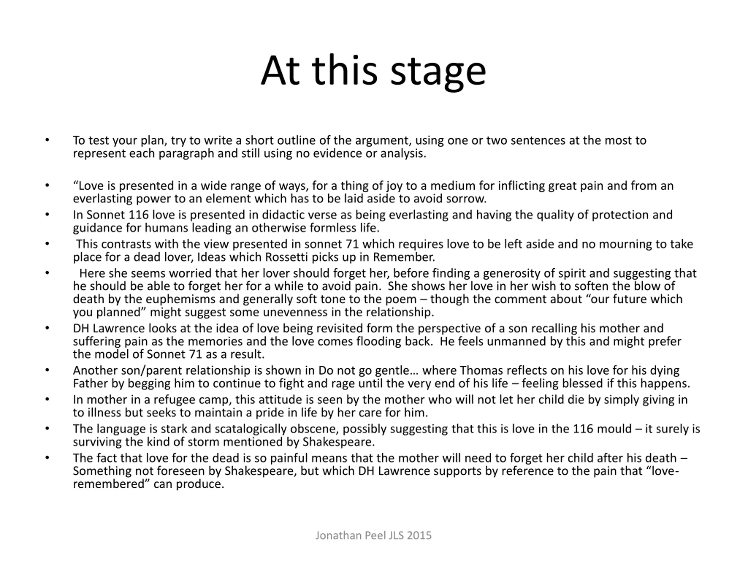 At this stage To test your plan, try to write a short outline of the argument, using one or two sentences at the most to represent each paragraph and still using no evidence or analysis. Love is presented in a wide range of ways, for a thing of joy to a medium for inflicting great pain and from an everlasting power to an element which has to be laid aside to avoid sorrow. In Sonnet 116 love is presented in didactic verse as being everlasting and having the quality of protection and guidance for humans leading an otherwise formless life. This contrasts with the view presented in sonnet 71 which requires love to be left aside and no mourning to take place for a dead lover, Ideas which Rossetti picks up in Remember. Here she seems worried that her lover should forget her, before finding a generosity of spirit and suggesting that he should be able to forget her for a while to avoid pain. She shows her love in her wish to soften the blow of death by the euphemisms and generally soft tone to the poem though the comment about our future which you planned might suggest some unevenness in the relationship. DH Lawrence looks at the idea of love being revisited form the perspective of a son recalling his mother and suffering pain as the memories and the love comes flooding back. He feels unmanned by this and might prefer the model of Sonnet 71 as a result. Another son/parent relationship is shown in Do not go gentle where Thomas reflects on his love for his dying Father by begging him to continue to fight and rage until the very end of his life feeling blessed if this happens. In mother in a refugee camp, this attitude is seen by the mother who will not let her child die by simply giving in to illness but seeks to maintain a pride in life by her care for him. The language is stark and scatalogically obscene, possibly suggesting that this is love in the 116 mould it surely is surviving the kind of storm mentioned by Shakespeare. The fact that love for the dead is so painful means that the mother will need to forget her child after his death Something not foreseen by Shakespeare, but which DH Lawrence supports by reference to the pain that love- remembered can produce. Jonathan Peel JLS 2015