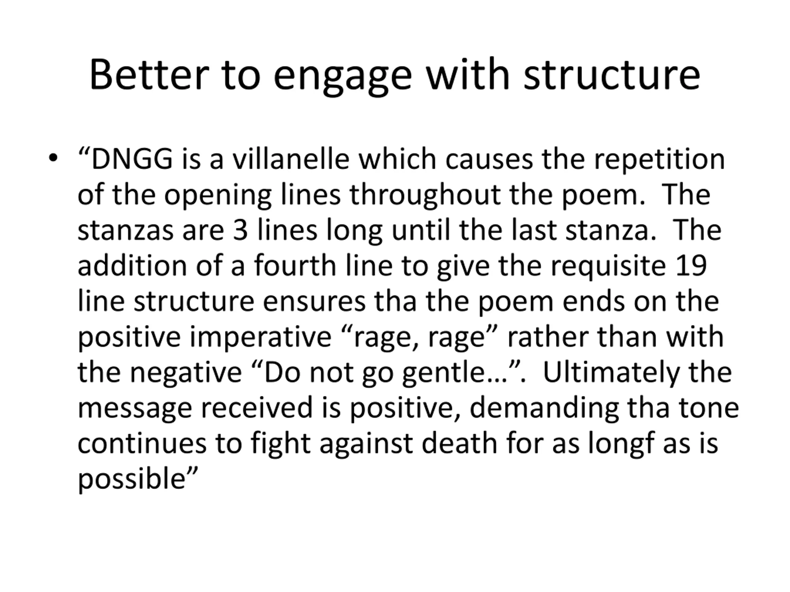 Better to engage with structure DNGG is a villanelle which causes the repetition of the opening lines throughout the poem. The stanzas are 3 lines long until the last stanza. The addition of a fourth line to give the requisite 19 line structure ensures tha the poem ends on the positive imperative rage, rage rather than with the negative Do not go gentle . Ultimately the message received is positive, demanding tha tone continues to fight against death for as longf as is possible