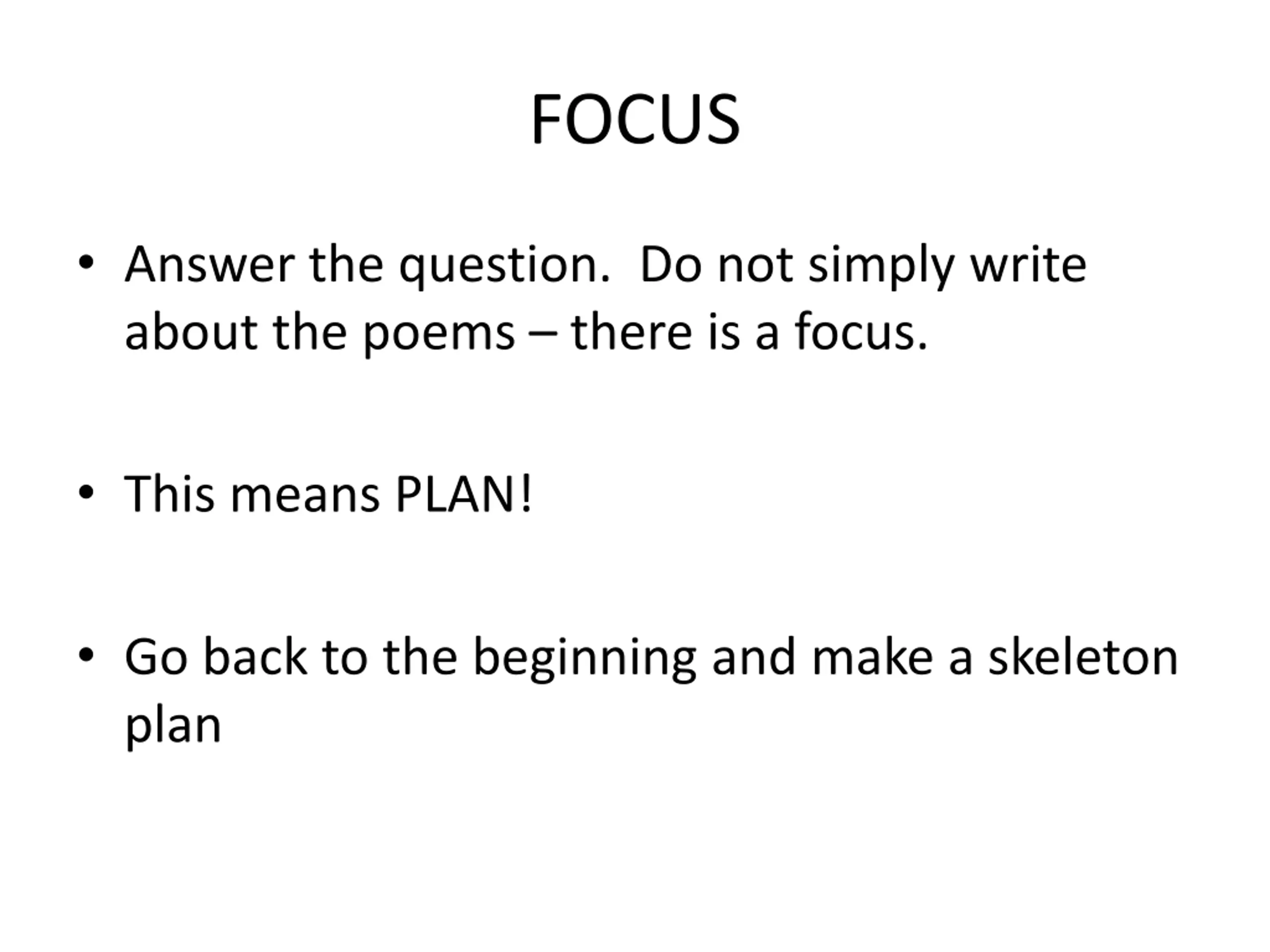 FOCUS Answer the question. Do not simply write about the poems there is a focus. This means PLAN! Go back to the beginning and make a skeleton plan
