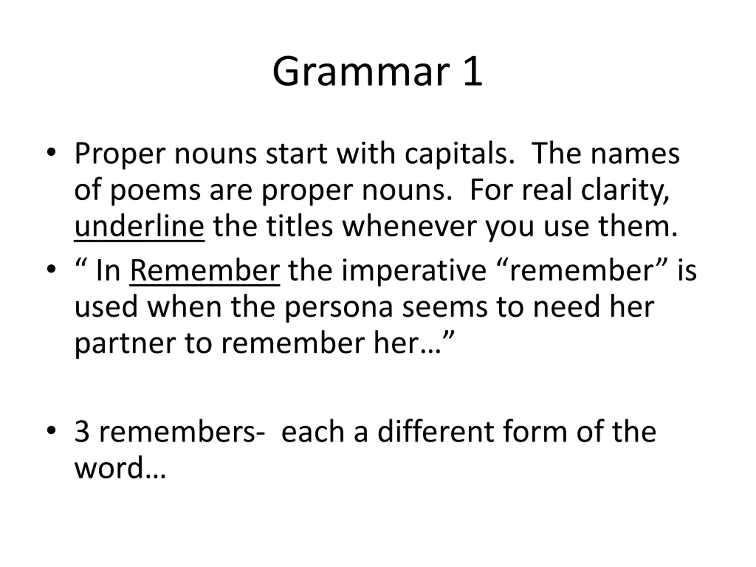 Grammar 1 Proper nouns start with capitals. The names of poems are proper nouns. For real clarity, underline the titles whenever you use them. In Remember the imperative remember is used when the persona seems to need her partner to remember her 3 remembers- each a different form of the word
