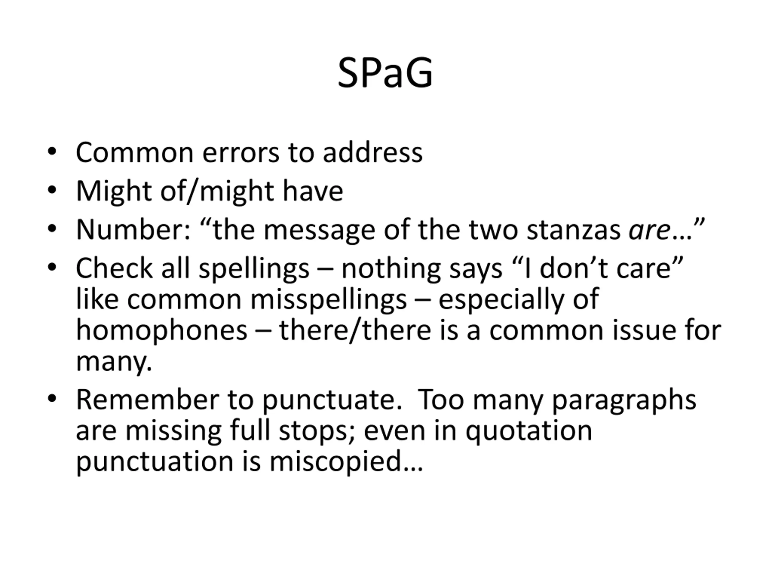 SPaG Common errors to address Might of/might have Number: the message of the two stanzas are Check all spellings nothing says I don t care like common misspellings especially of homophones there/there is a common issue for many. Remember to punctuate. Too many paragraphs are missing full stops; even in quotation punctuation is miscopied