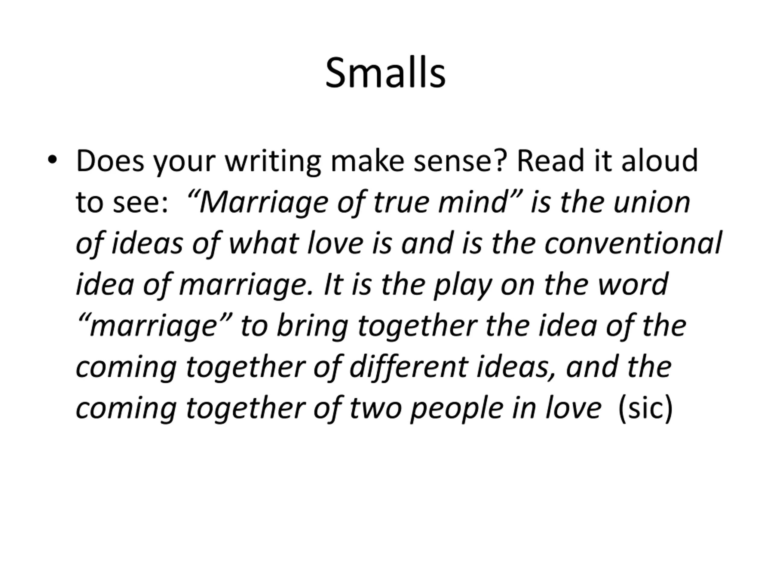 Smalls Does your writing make sense? Read it aloud to see: Marriage of true mind is the union of ideas of what love is and is the conventional idea of marriage. It is the play on the word marriage to bring together the idea of the coming together of different ideas, and the coming together of two people in love (sic)