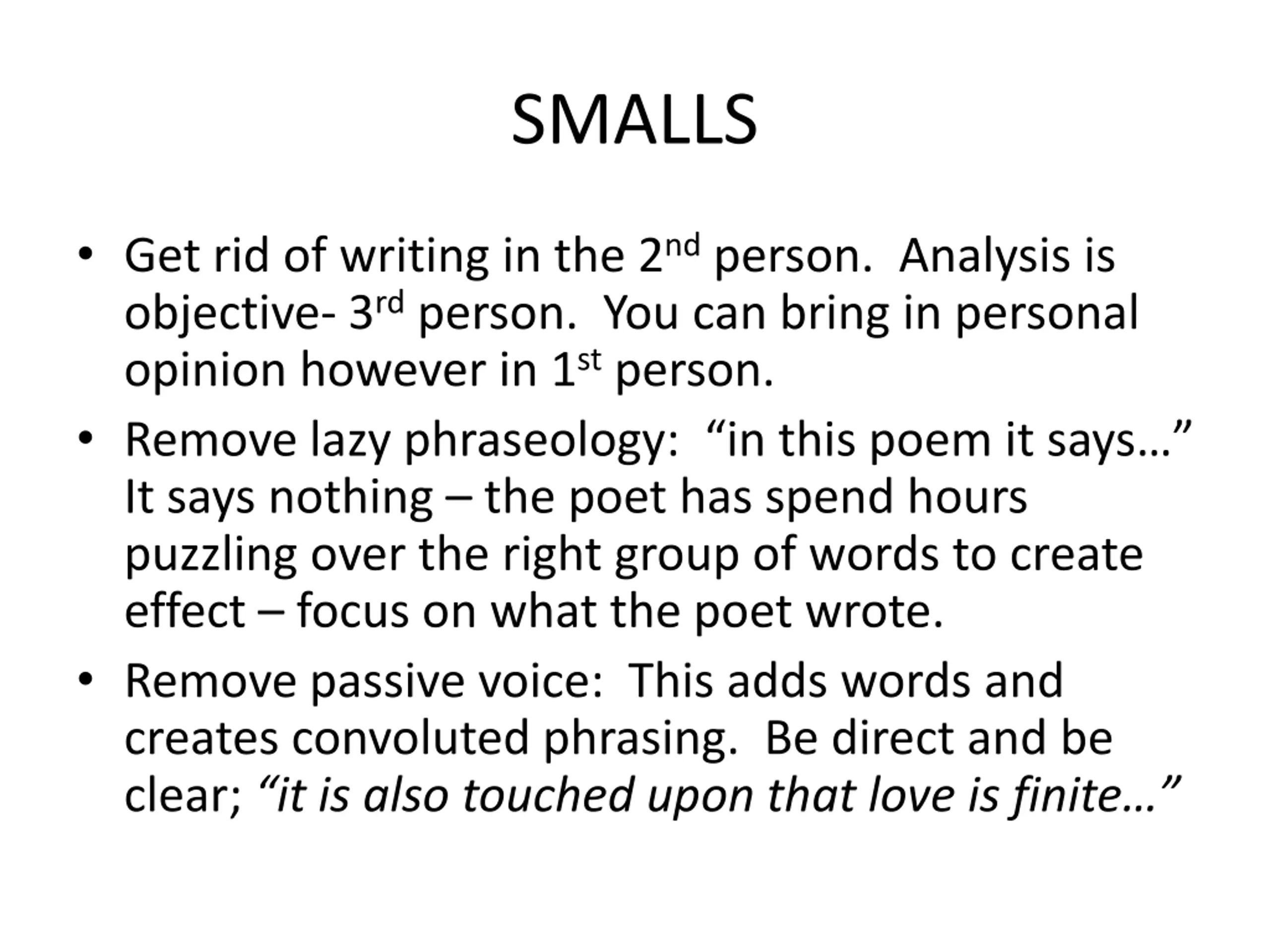 SMALLS Get rid of writing in the 2nd person. Analysis is objective- 3rd person. You can bring in personal opinion however in 1st person. Remove lazy phraseology: in this poem it says It says nothing the poet has spend hours puzzling over the right group of words to create effect focus on what the poet wrote. Remove passive voice: This adds words and creates convoluted phrasing. Be direct and be clear; it is also touched upon that love is finite