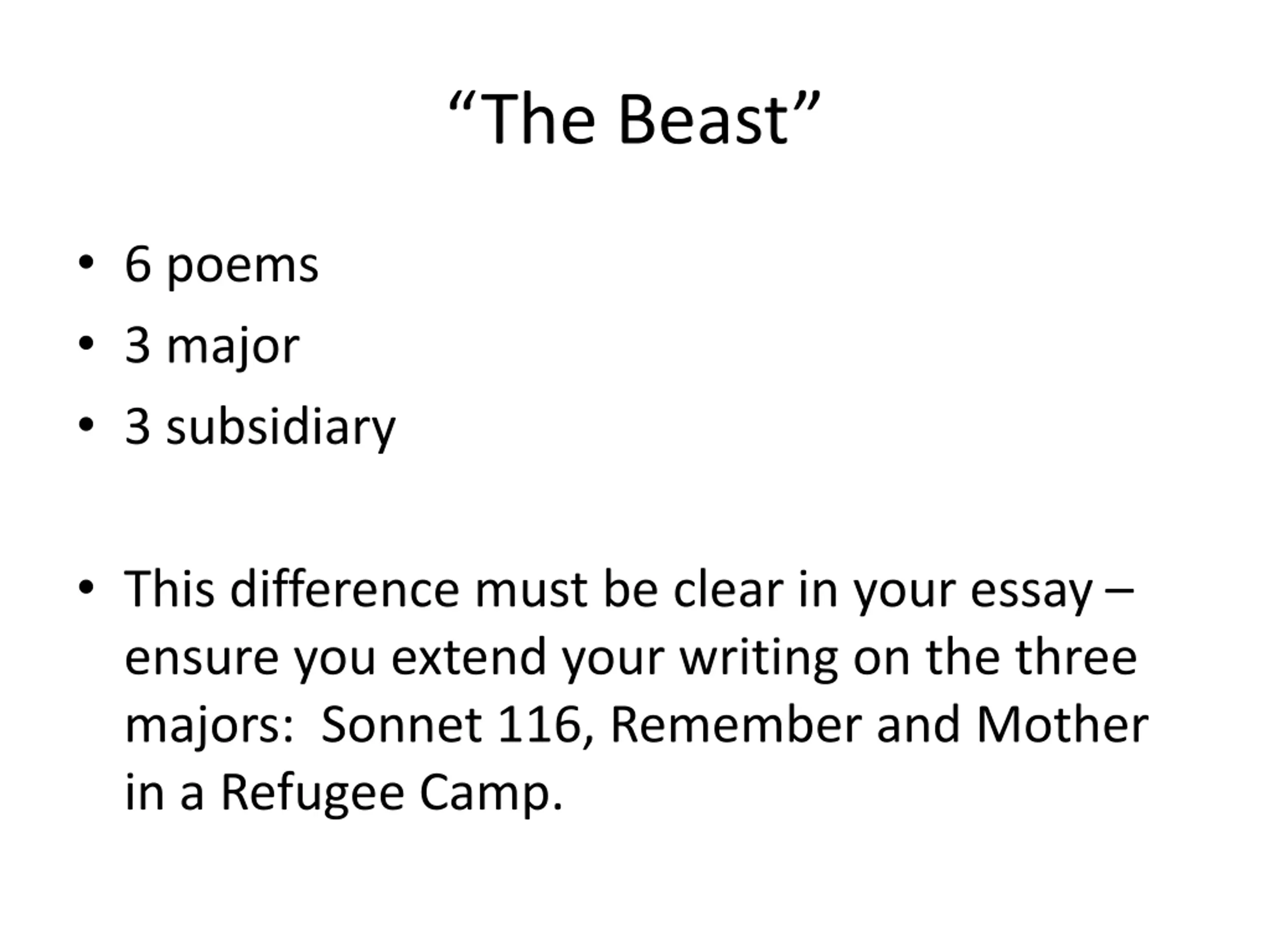The Beast 6 poems 3 major 3 subsidiary This difference must be clear in your essay ensure you extend your writing on the three majors: Sonnet 116, Remember and Mother in a Refugee Camp.