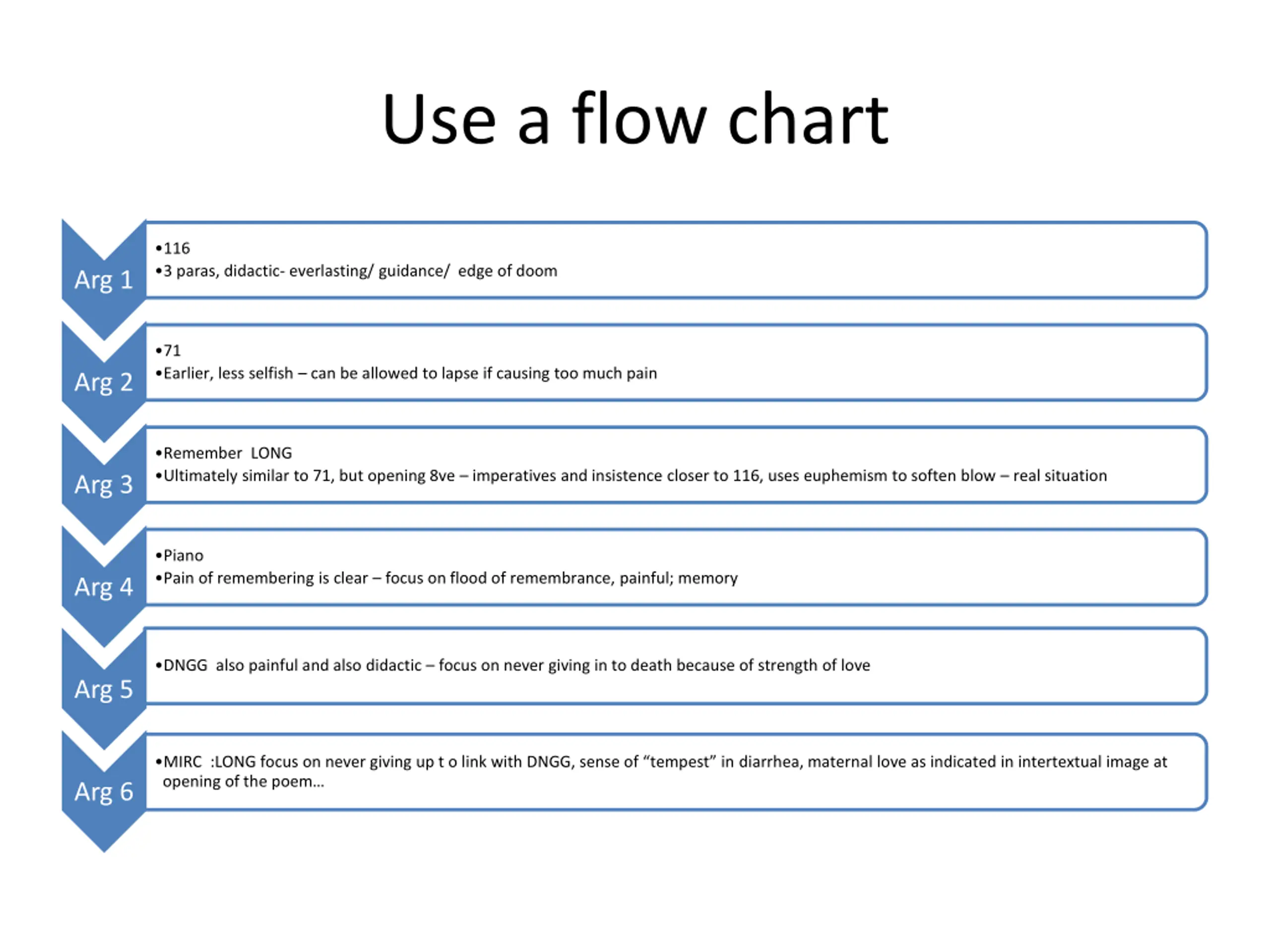 Use a flow chart 116 3 paras, didactic- everlasting/ guidance/ edge of doom Arg 1 71 Earlier, less selfish can be allowed to lapse if causing too much pain Arg 2 Remember LONG Ultimately similar to 71, but opening 8ve imperatives and insistence closer to 116, uses euphemism to soften blow real situation Arg 3 Piano Pain of remembering is clear focus on flood of remembrance, painful; memory Arg 4 DNGG also painful and also didactic focus on never giving in to death because of strength of love Arg 5 MIRC :LONG focus on never giving up t o link with DNGG, sense of tempest in diarrhea, maternal love as indicated in intertextual image at opening of the poem Arg 6