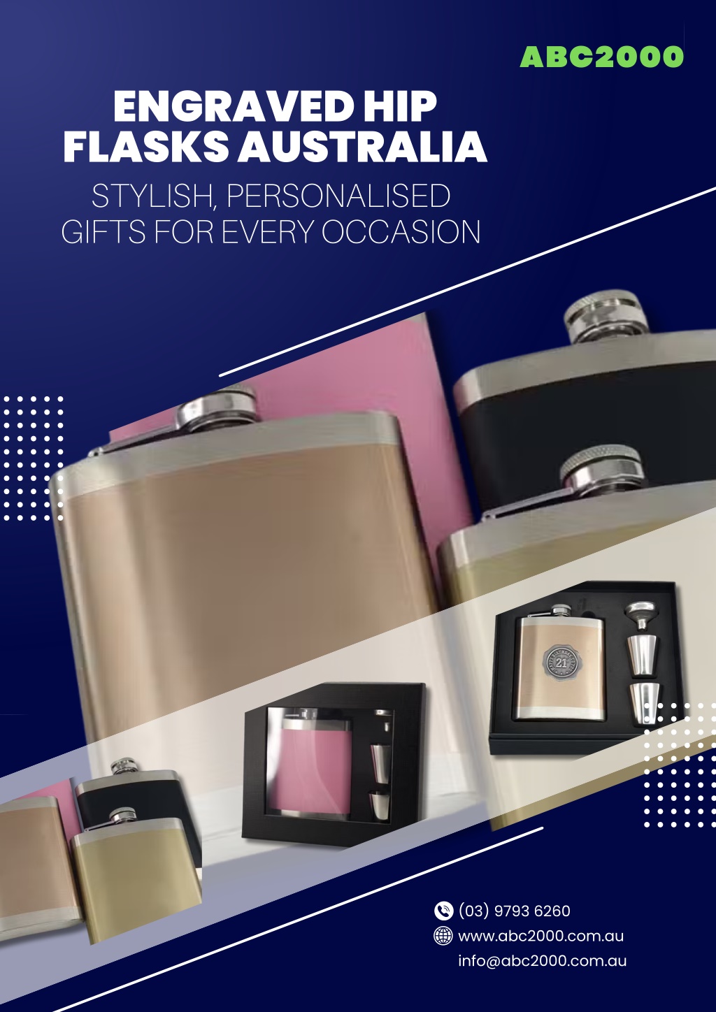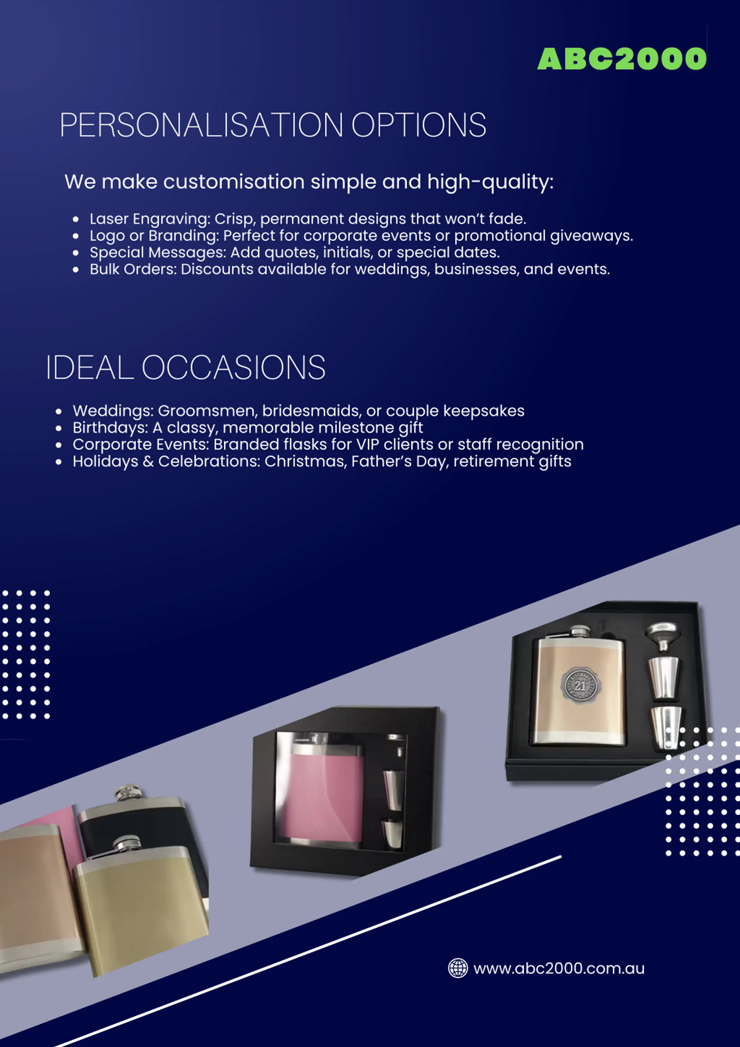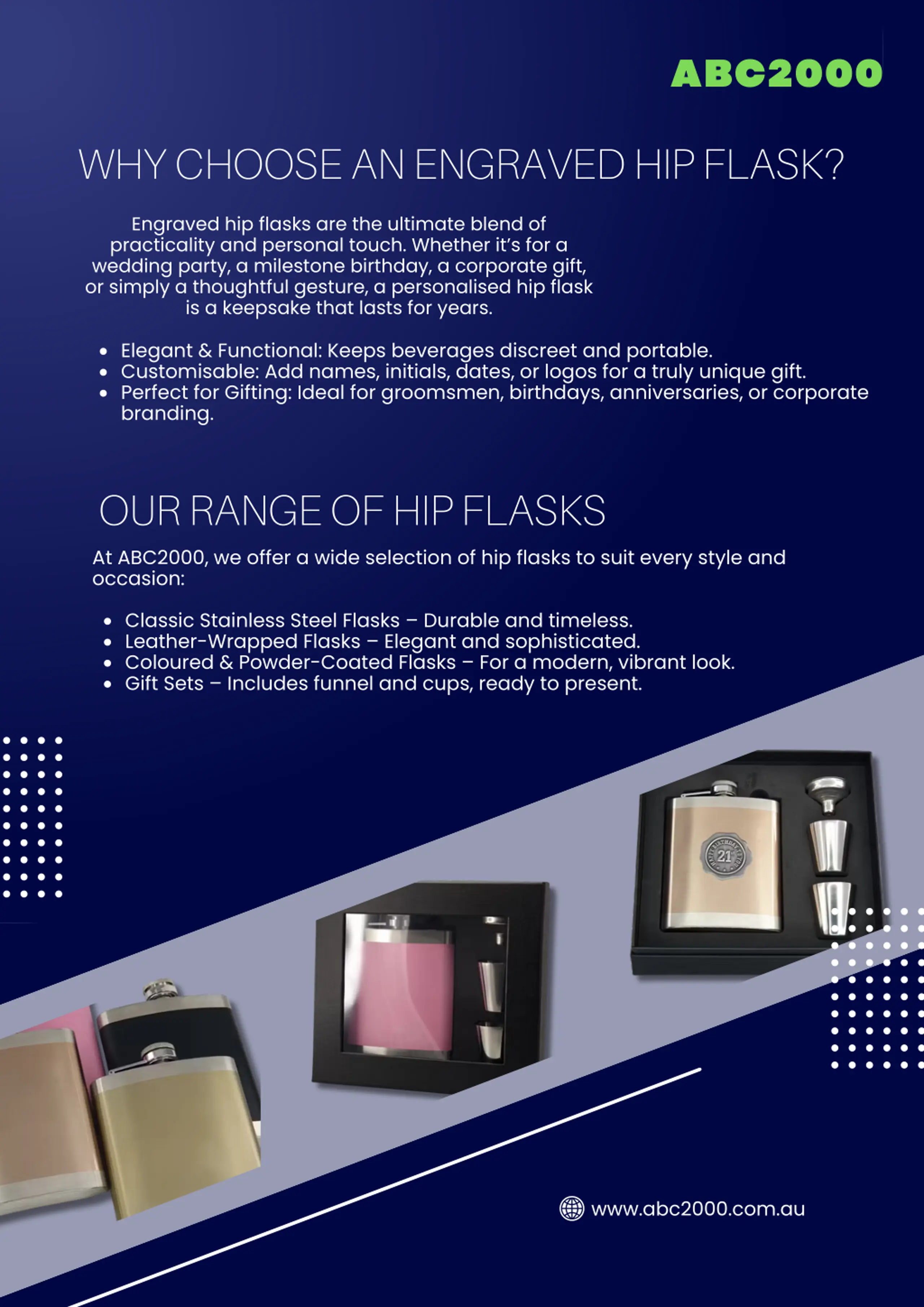 ABC2000 WHY CHOOSE AN ENGRAVED HIP FLASK? Engraved hip flasks are the ultimate blend of practicality and personal touch. Whether it s for a wedding party, a milestone birthday, a corporate gift, or simply a thoughtful gesture, a personalised hip flask is a keepsake that lasts for years. Elegant & Functional: Keeps beverages discreet and portable. Customisable: Add names, initials, dates, or logos for a truly unique gift. Perfect for Gifting: Ideal for groomsmen, birthdays, anniversaries, or corporate branding. OUR RANGE OF HIP FLASKS At ABC2000, we offer a wide selection of hip flasks to suit every style and occasion: Classic Stainless Steel Flasks Durable and timeless. Leather-Wrapped Flasks Elegant and sophisticated. Coloured & Powder-Coated Flasks For a modern, vibrant look. Gift Sets Includes funnel and cups, ready to present. www.abc2000.com.au