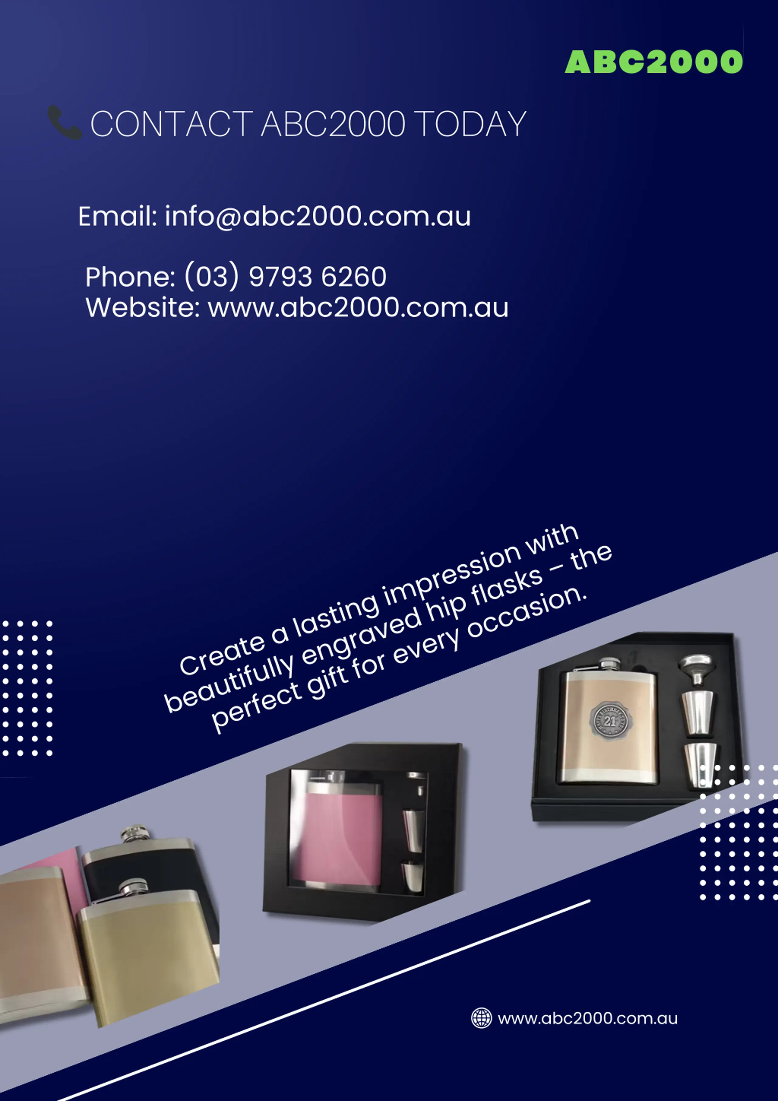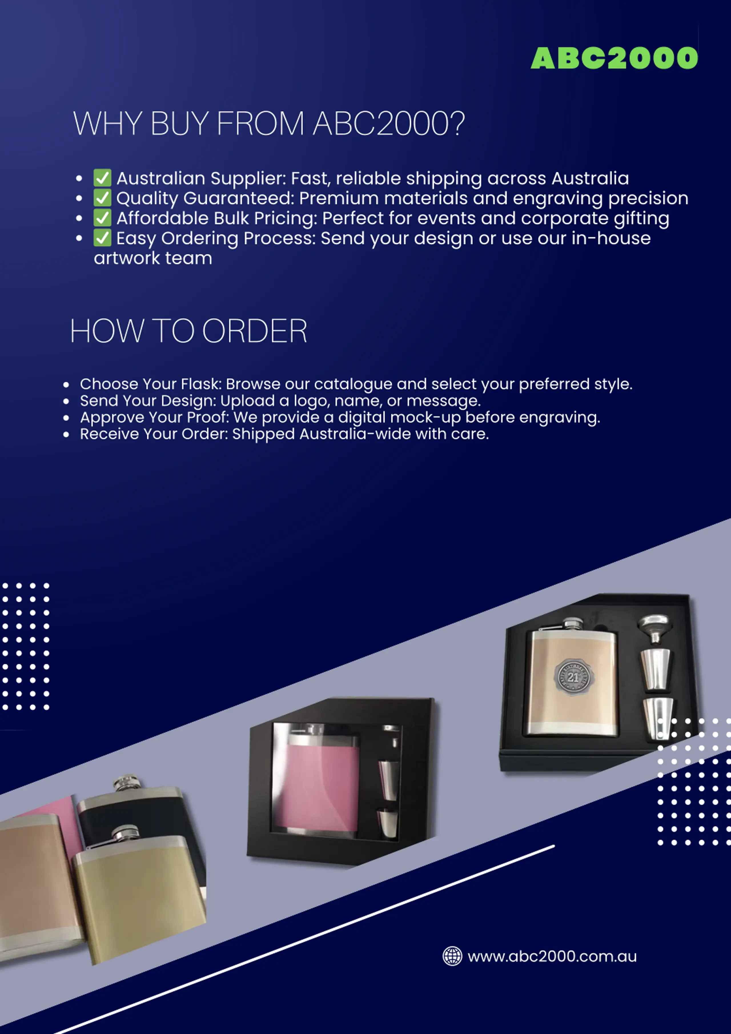 ABC2000 WHY BUY FROM ABC2000? Australian Supplier: Fast, reliable shipping across Australia Quality Guaranteed: Premium materials and engraving precision Affordable Bulk Pricing: Perfect for events and corporate gifting Easy Ordering Process: Send your design or use our in-house artwork team HOW TO ORDER Choose Your Flask: Browse our catalogue and select your preferred style. Send Your Design: Upload a logo, name, or message. Approve Your Proof: We provide a digital mock-up before engraving. Receive Your Order: Shipped Australia-wide with care. www.abc2000.com.au