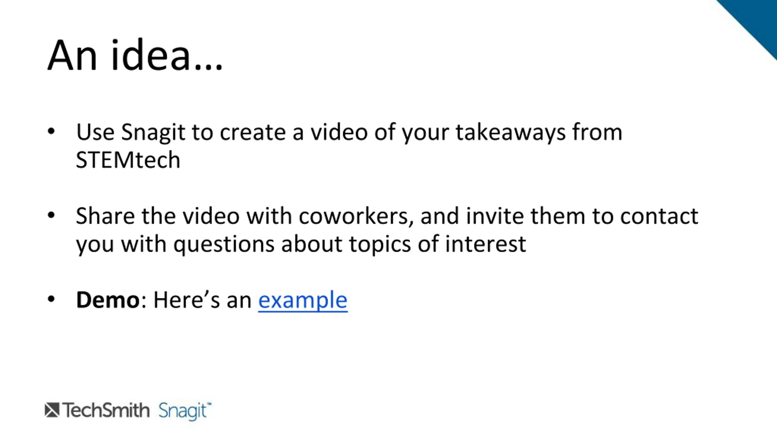 An idea Use Snagit to create a video of your takeaways from STEMtech Share the video with coworkers, and invite them to contact you with questions about topics of interest Demo: Here s an example