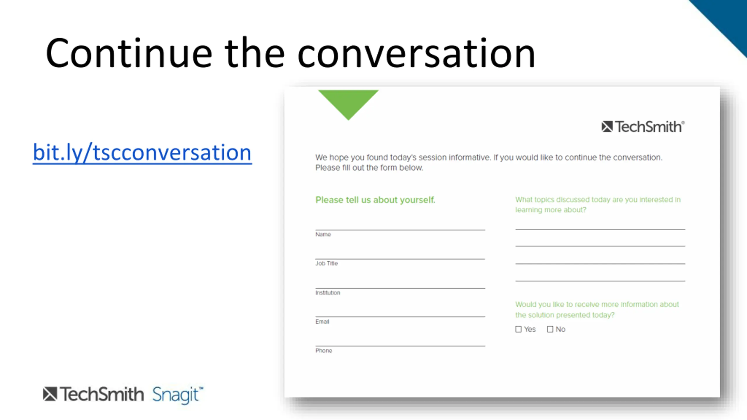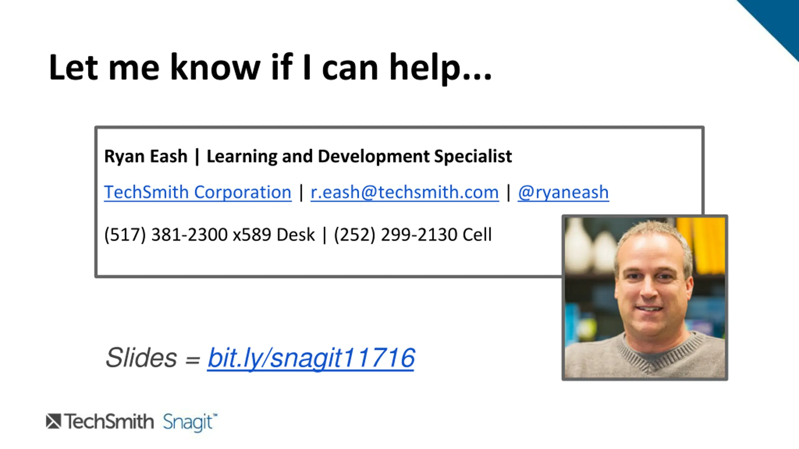Let me know if I can help... Ryan Eash | Learning and Development Specialist TechSmith Corporation | r.eash@techsmith.com | @ryaneash (517) 381-2300 x589 Desk | (252) 299-2130 Cell Slides = bit.ly/snagit11716