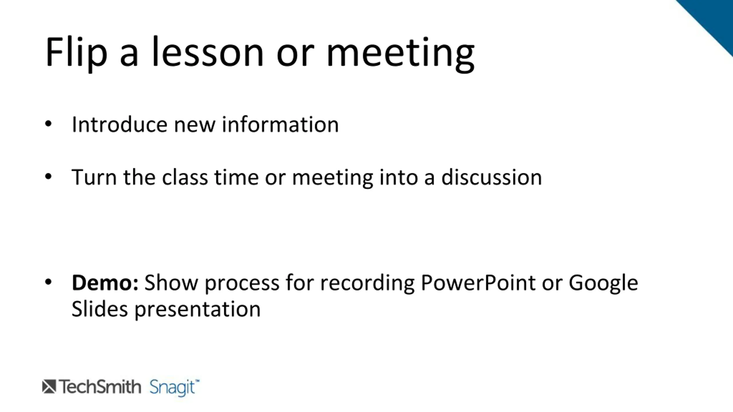 Flip a lesson or meeting Introduce new information Turn the class time or meeting into a discussion Demo: Show process for recording PowerPoint or Google Slides presentation