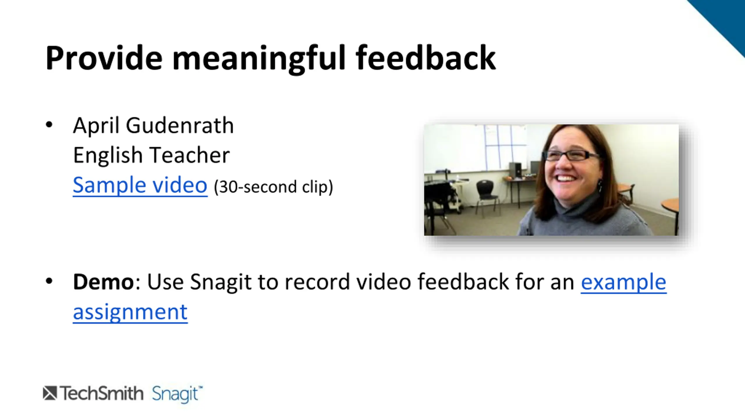 Provide meaningful feedback April Gudenrath English Teacher Sample video (30-second clip) Demo: Use Snagit to record video feedback for an example assignment
