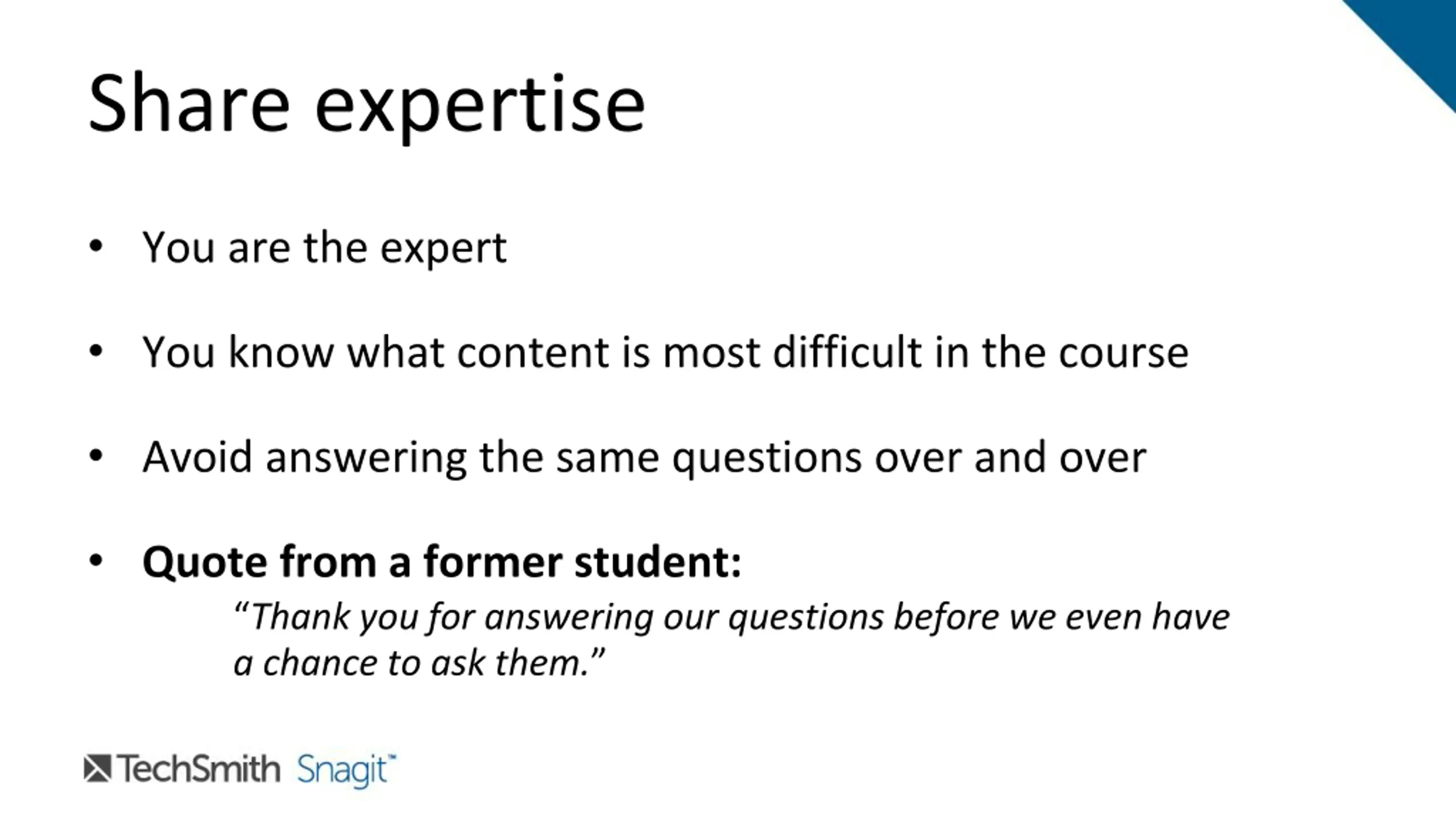 Share expertise You are the expert You know what content is most difficult in the course Avoid answering the same questions over and over Quote from a former student: Thank you for answering our questions before we even have a chance to ask them.
