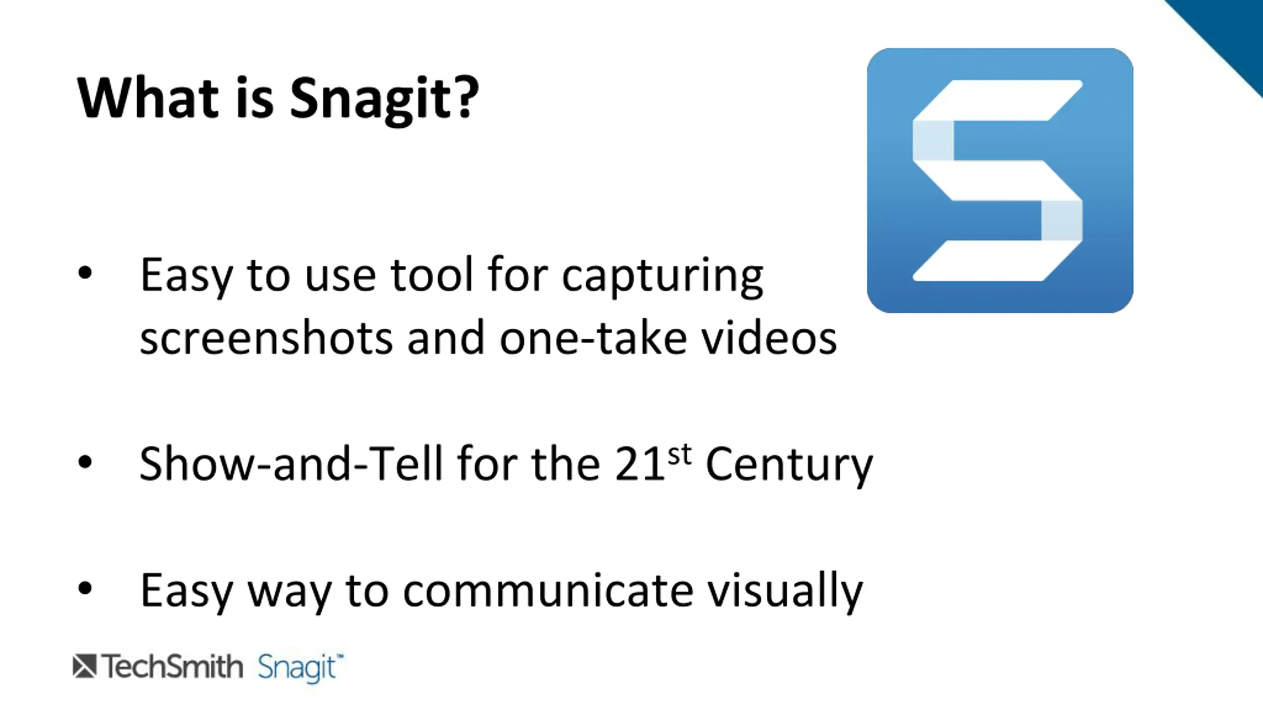 What is Snagit? Easy to use tool for capturing screenshots and one-take videos Show-and-Tell for the 21stCentury Easy way to communicate visually