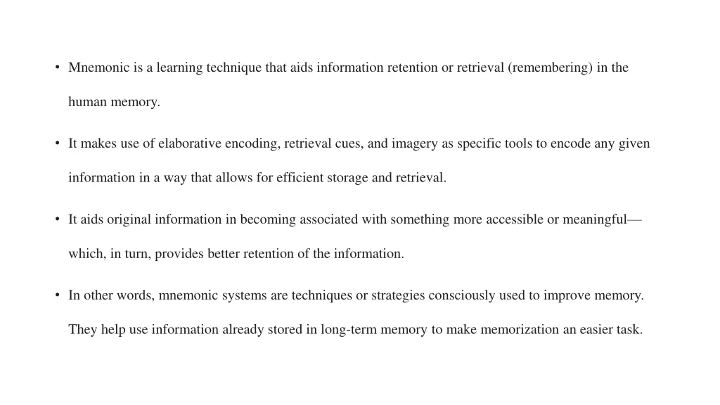 Mnemonic is a learning technique that aids information retention or retrieval (remembering) in the human memory. It makes use of elaborative encoding, retrieval cues, and imagery as specific tools to encode any given information in a way that allows for efficient storage and retrieval. It aids original information in becoming associated with something more accessible or meaningful which, in turn, provides better retention of the information. In other words, mnemonic systems are techniques or strategies consciously used to improve memory. They help use information already stored in long-term memory to make memorization an easier task.