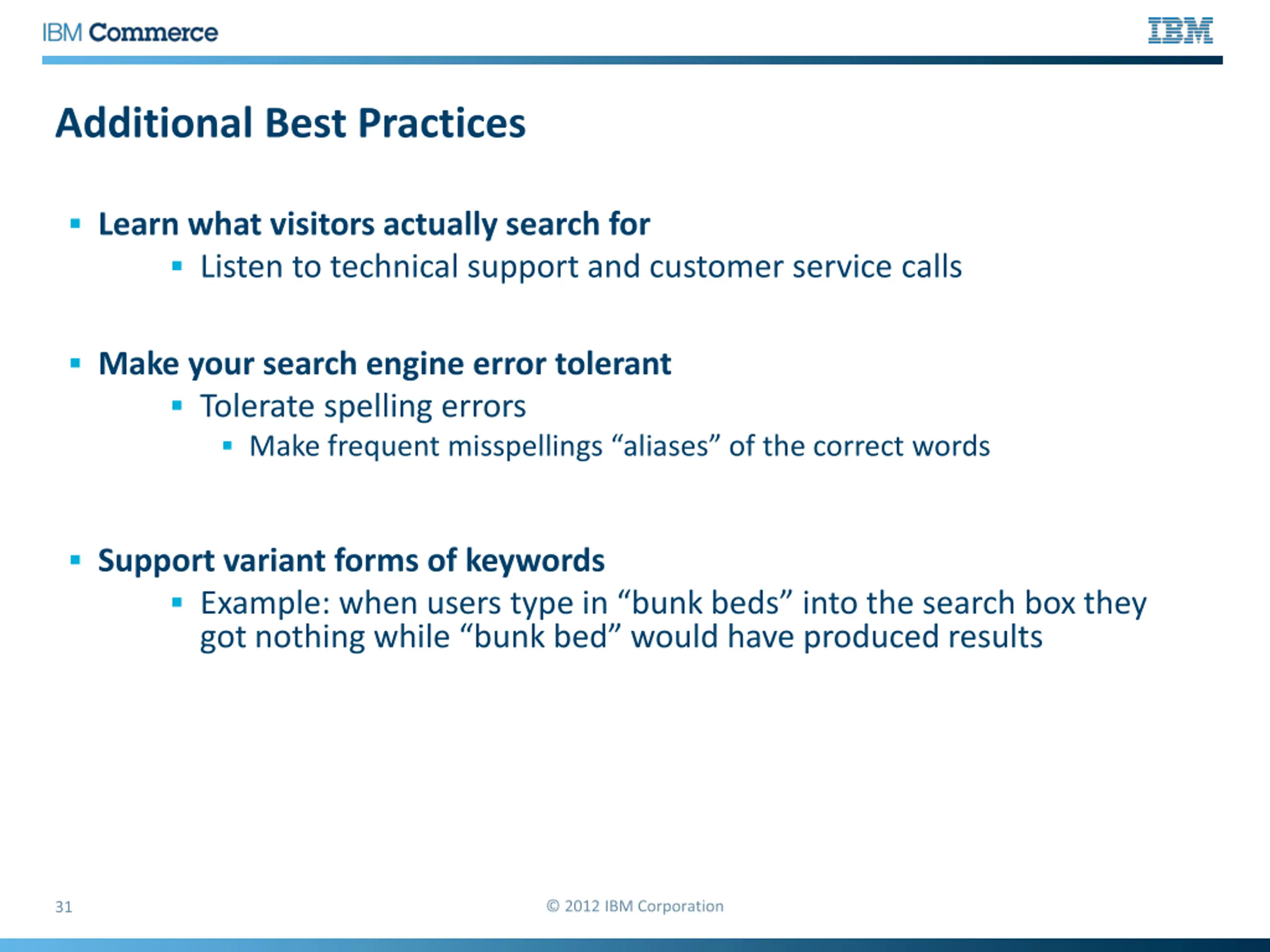 Additional Best Practices Learn what visitors actually search for Listen to technical support and customer service calls Make your search engine error tolerant Tolerate spelling errors Make frequent misspellings aliases of the correct words Support variant forms of keywords Example: when users type in bunk beds into the search box they got nothing while bunk bed would have produced results