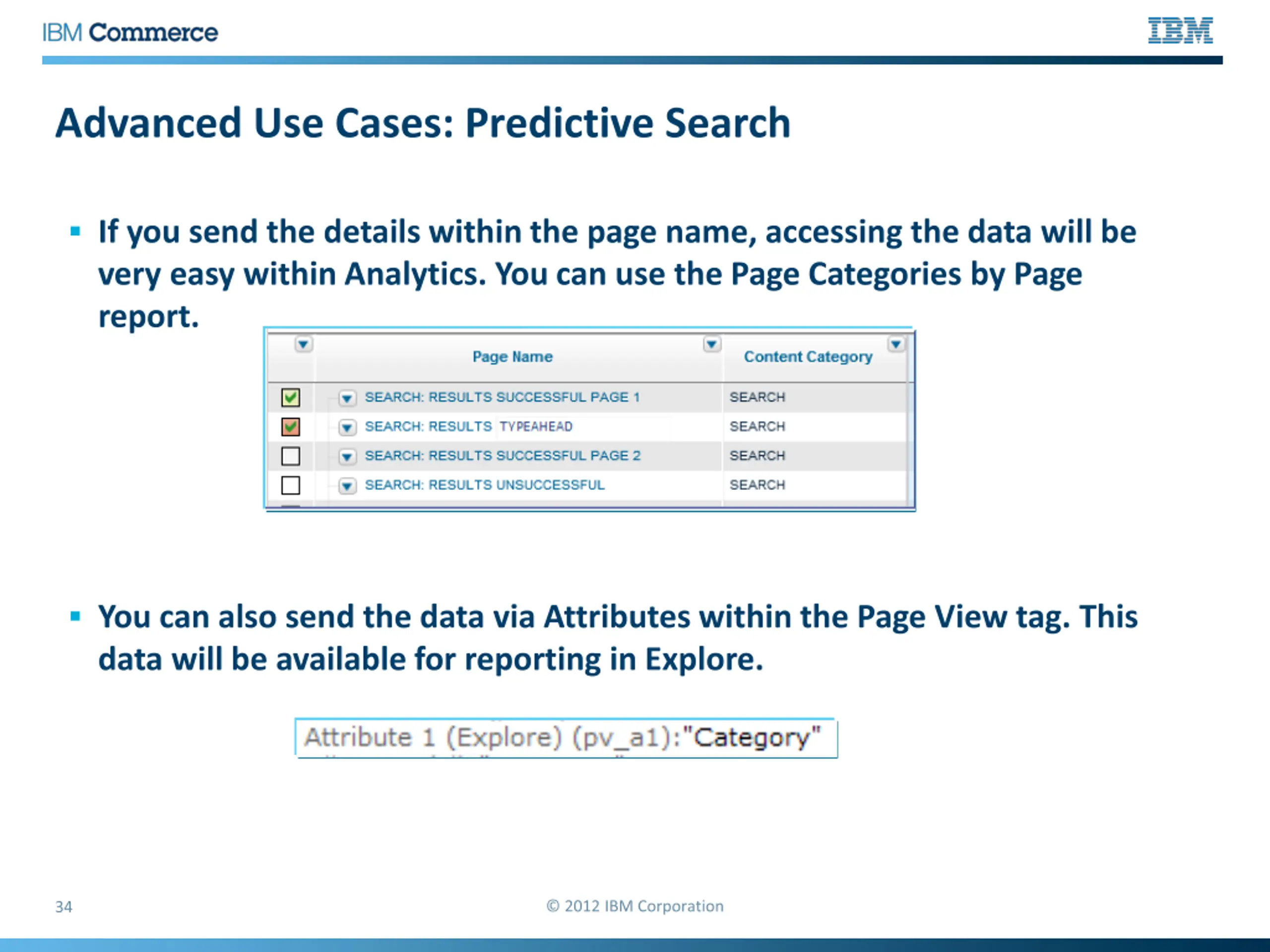 Advanced Use Cases: Predictive Search If you send the details within the page name, accessing the data will be very easy within Analytics. You can use the Page Categories by Page report. You can also send the data via Attributes within the Page View tag. This data will be available for reporting in Explore.