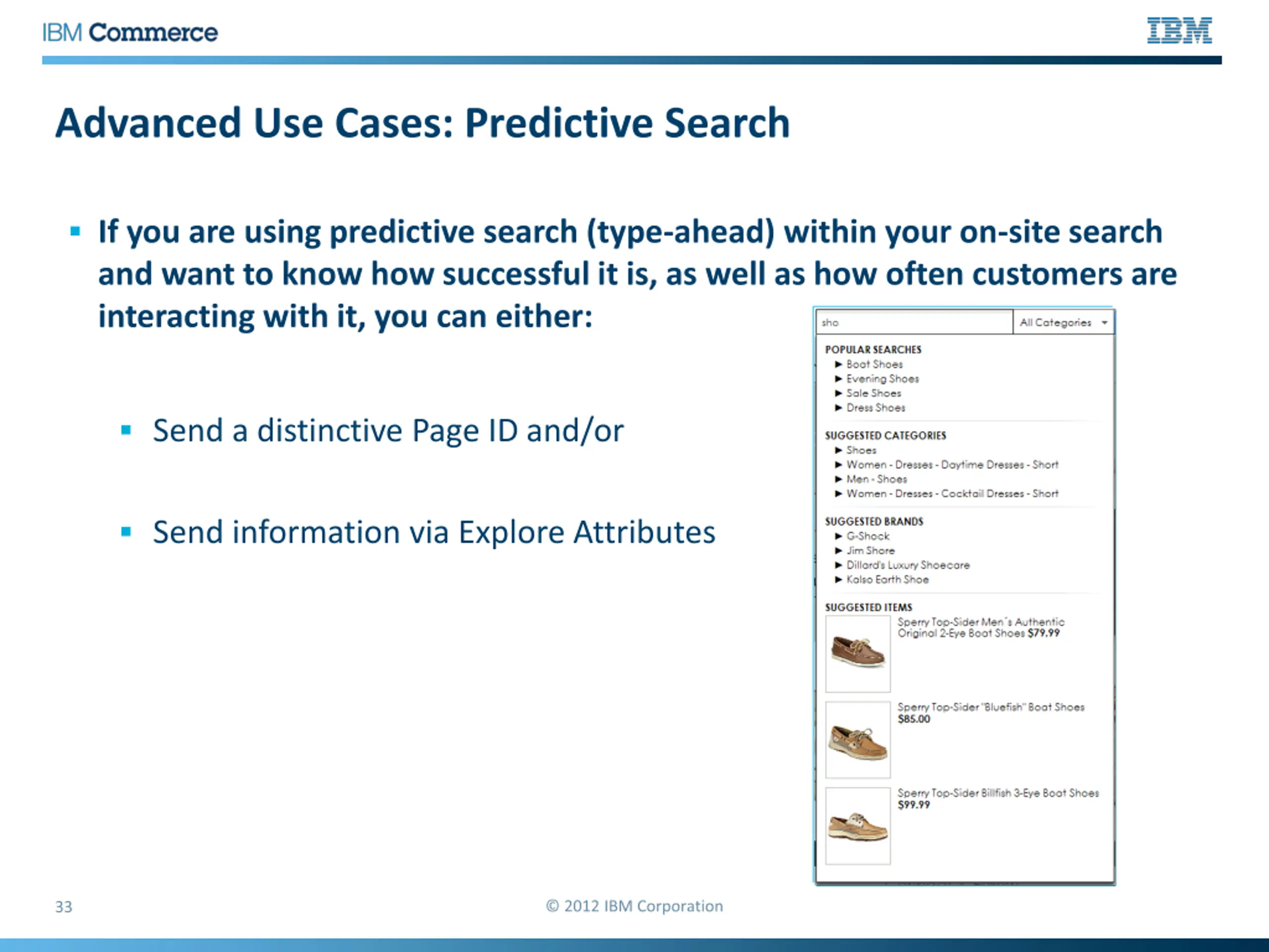 Advanced Use Cases: Predictive Search If you are using predictive search (type-ahead) within your on-site search and want to know how successful it is, as well as how often customers are interacting with it, you can either: Send a distinctive Page ID and/or Send information via Explore Attributes