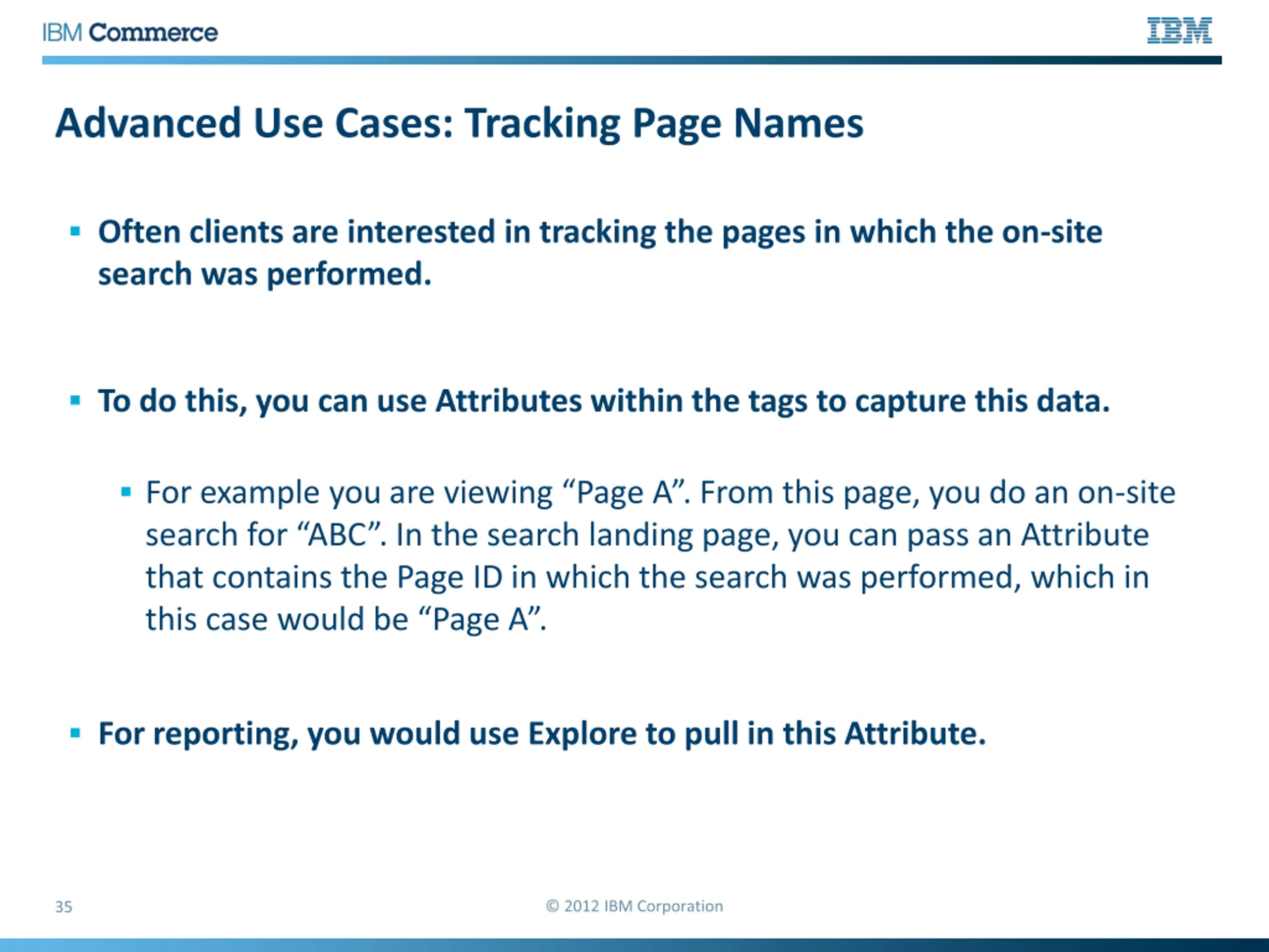 Advanced Use Cases: Tracking Page Names Often clients are interested in tracking the pages in which the on-site search was performed. To do this, you can use Attributes within the tags to capture this data. For example you are viewing Page A . From this page, you do an on-site search for ABC . In the search landing page, you can pass an Attribute that contains the Page ID in which the search was performed, which in this case would be Page A . For reporting, you would use Explore to pull in this Attribute.