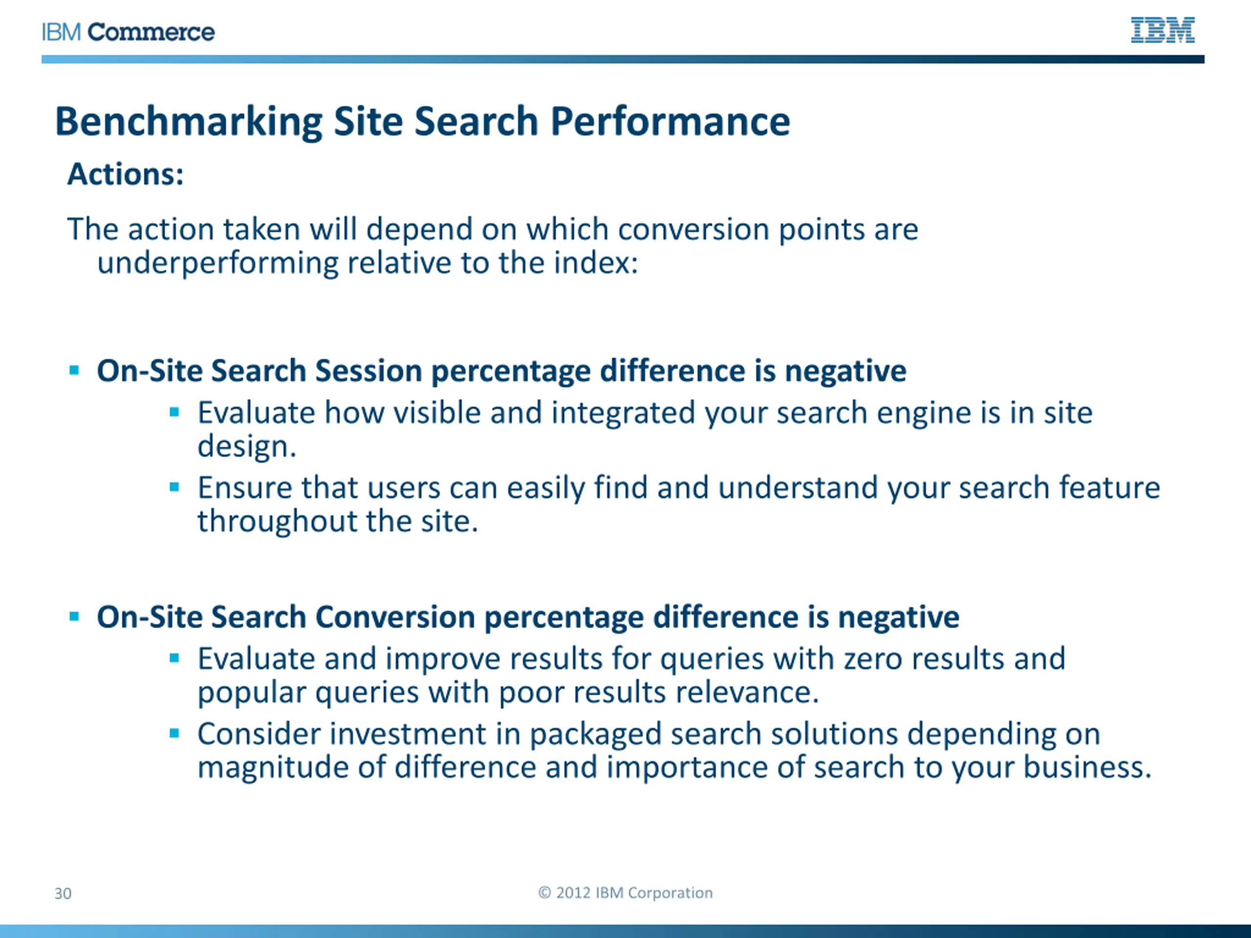 Benchmarking Site Search Performance Actions: The action taken will depend on which conversion points are underperforming relative to the index: On-Site Search Session percentage difference is negative Evaluate how visible and integrated your search engine is in site design. Ensure that users can easily find and understand your search feature throughout the site. On-Site Search Conversion percentage difference is negative Evaluate and improve results for queries with zero results and popular queries with poor results relevance. Consider investment in packaged search solutions depending on magnitude of difference and importance of search to your business.