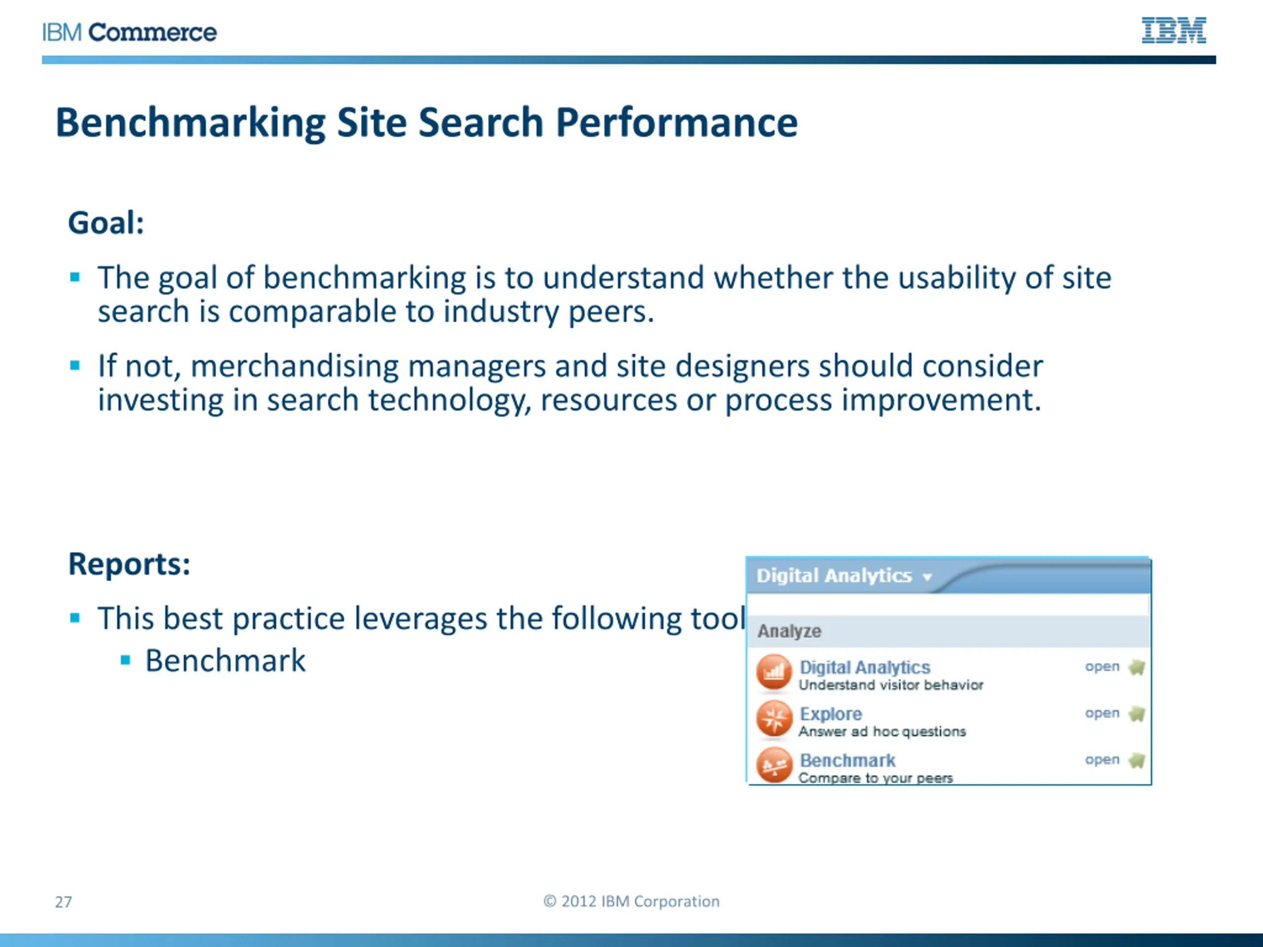 Benchmarking Site Search Performance Goal: The goal of benchmarking is to understand whether the usability of site search is comparable to industry peers. If not, merchandising managers and site designers should consider investing in search technology, resources or process improvement. Reports: This best practice leverages the following tool: Benchmark
