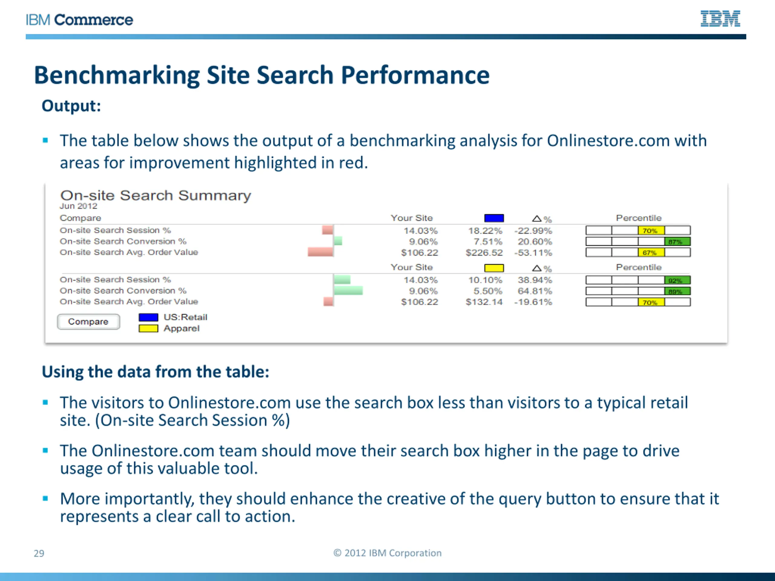 Benchmarking Site Search Performance Output: The table below shows the output of a benchmarking analysis for Onlinestore.com with areas for improvement highlighted in red. Using the data from the table: The visitors to Onlinestore.com use the search box less than visitors to a typical retail site. (On-site Search Session %) The Onlinestore.com team should move their search box higher in the page to drive usage of this valuable tool. More importantly, they should enhance the creative of the query button to ensure that it represents a clear call to action.