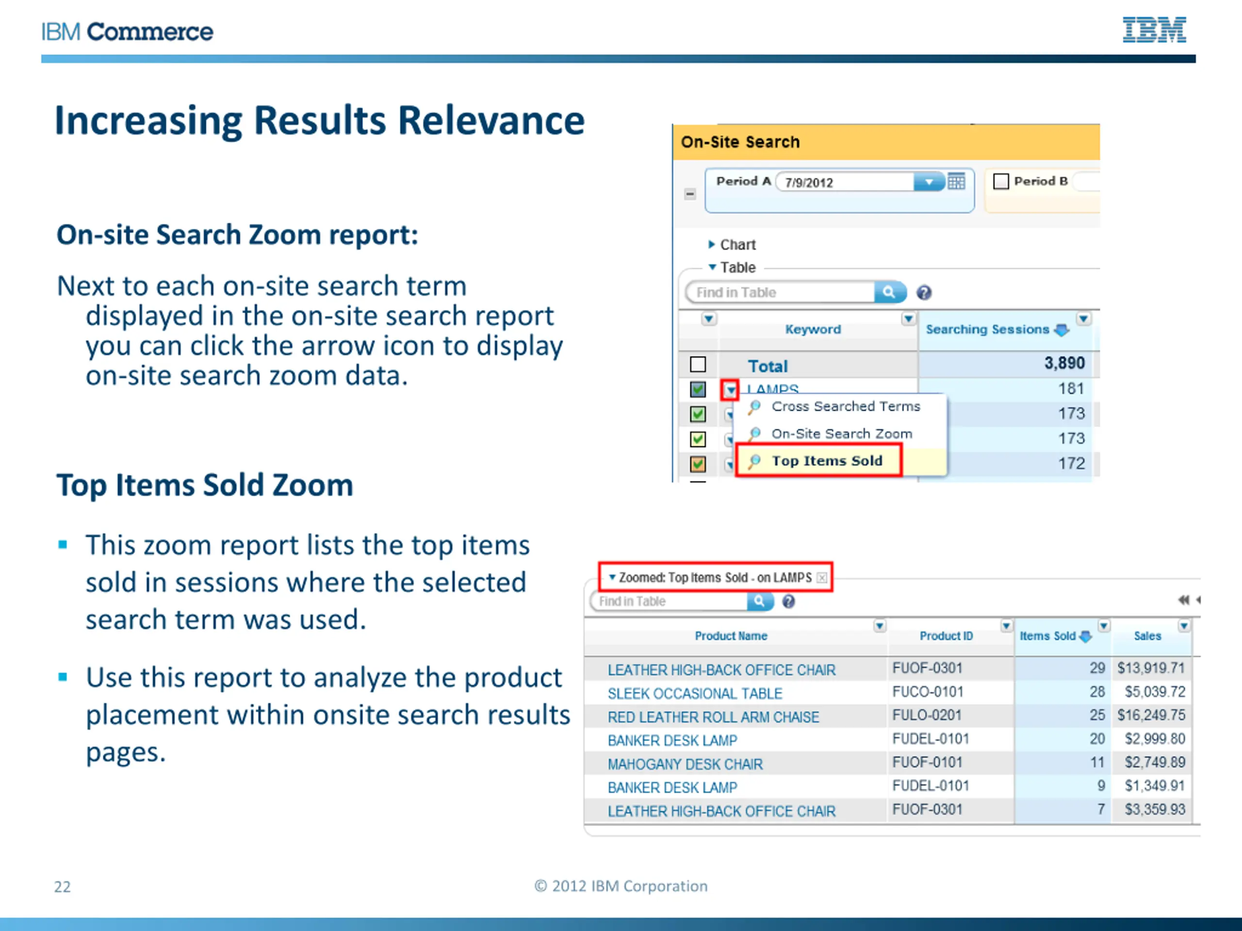 Increasing Results Relevance On-site Search Zoom report: Next to each on-site search term displayed in the on-site search report you can click the arrow icon to display on-site search zoom data. Top Items Sold Zoom This zoom report lists the top items sold in sessions where the selected search term was used. Use this report to analyze the product placement within onsite search results pages.