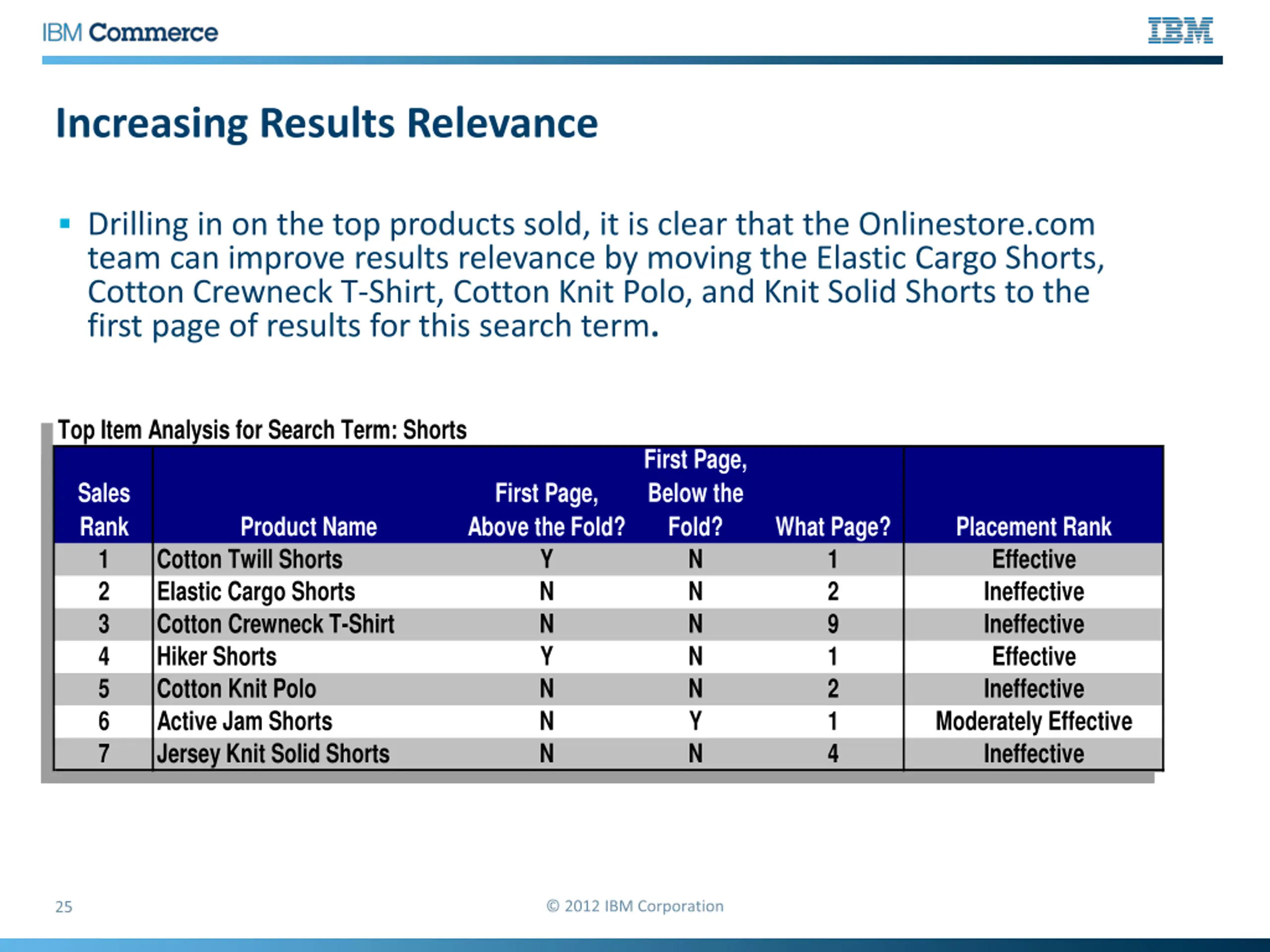 Increasing Results Relevance Drilling in on the top products sold, it is clear that the Onlinestore.com team can improve results relevance by moving the Elastic Cargo Shorts, Cotton Crewneck T-Shirt, Cotton Knit Polo, and Knit Solid Shorts to the first page of results for this search term. Top Item Analysis for Search Term: Shorts First Page, Below the Fold? N N N N N Y N Sales Rank 1 2 3 4 5 6 7 First Page, Above the Fold? Y N N Y N N N Product Name What Page? 1 2 9 1 2 1 4 Placement Rank Effective Ineffective Ineffective Effective Ineffective Moderately Effective Ineffective Cotton Twill Shorts Elastic Cargo Shorts Cotton Crewneck T-Shirt Hiker Shorts Cotton Knit Polo Active Jam Shorts Jersey Knit Solid Shorts