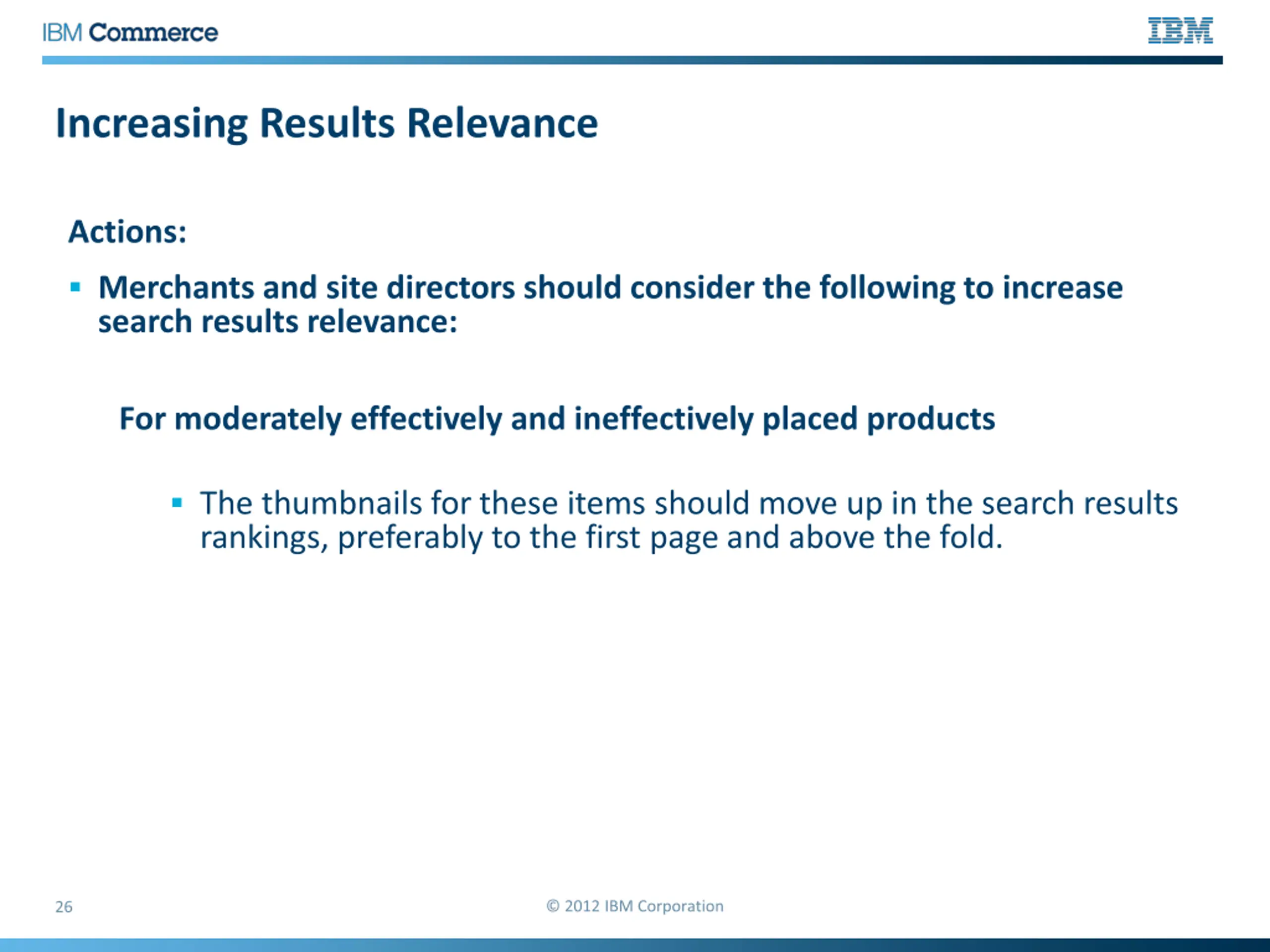 Increasing Results Relevance Actions: Merchants and site directors should consider the following to increase search results relevance: For moderately effectively and ineffectively placed products The thumbnails for these items should move up in the search results rankings, preferably to the first page and above the fold.