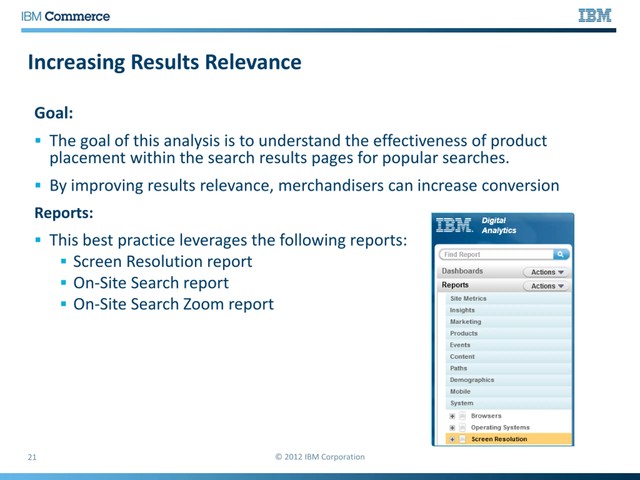Increasing Results Relevance Goal: The goal of this analysis is to understand the effectiveness of product placement within the search results pages for popular searches. By improving results relevance, merchandisers can increase conversion Reports: This best practice leverages the following reports: Screen Resolution report On-Site Search report On-Site Search Zoom report