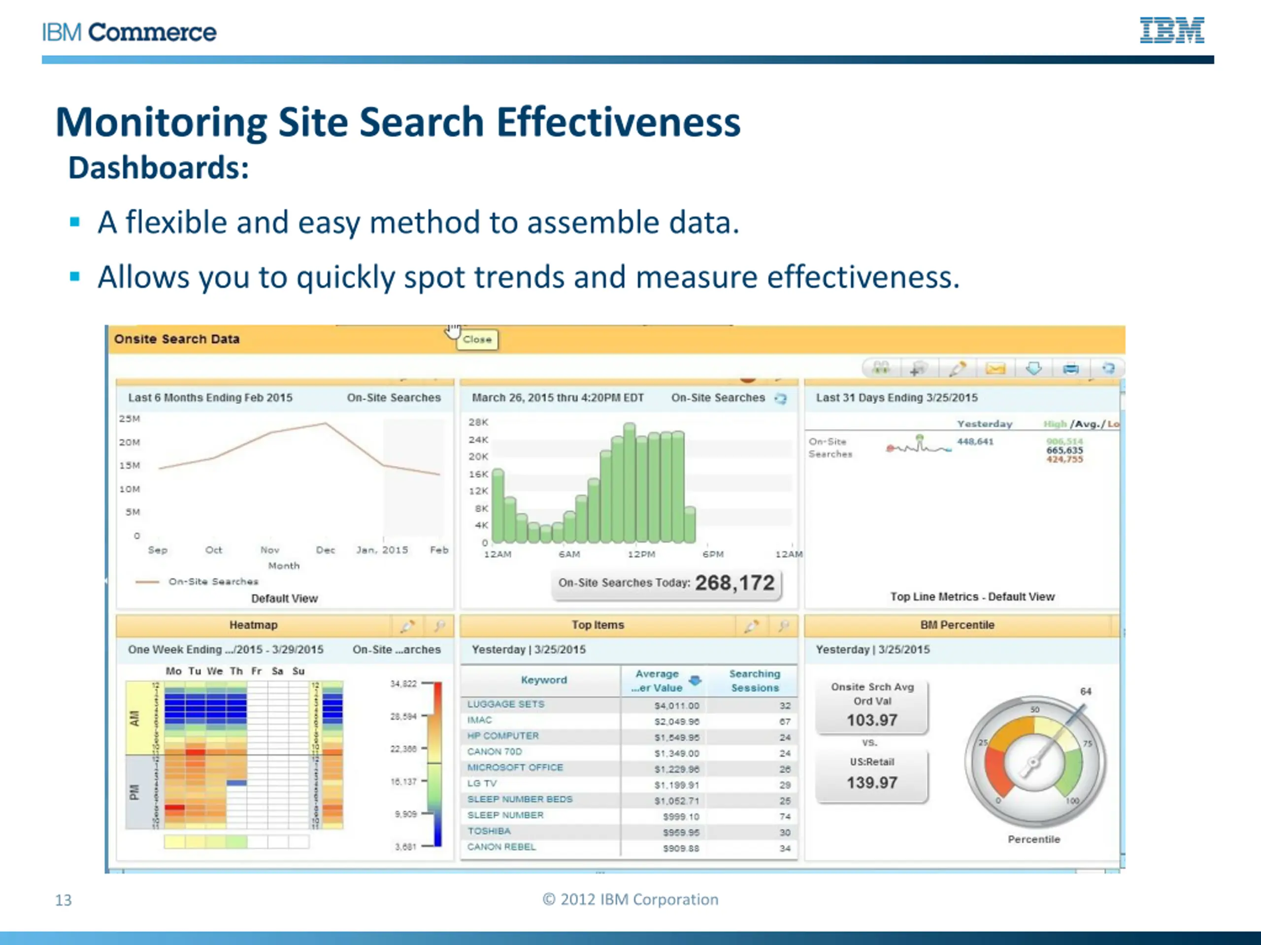 Monitoring Site Search Effectiveness Dashboards: A flexible and easy method to assemble data. Allows you to quickly spot trends and measure effectiveness.