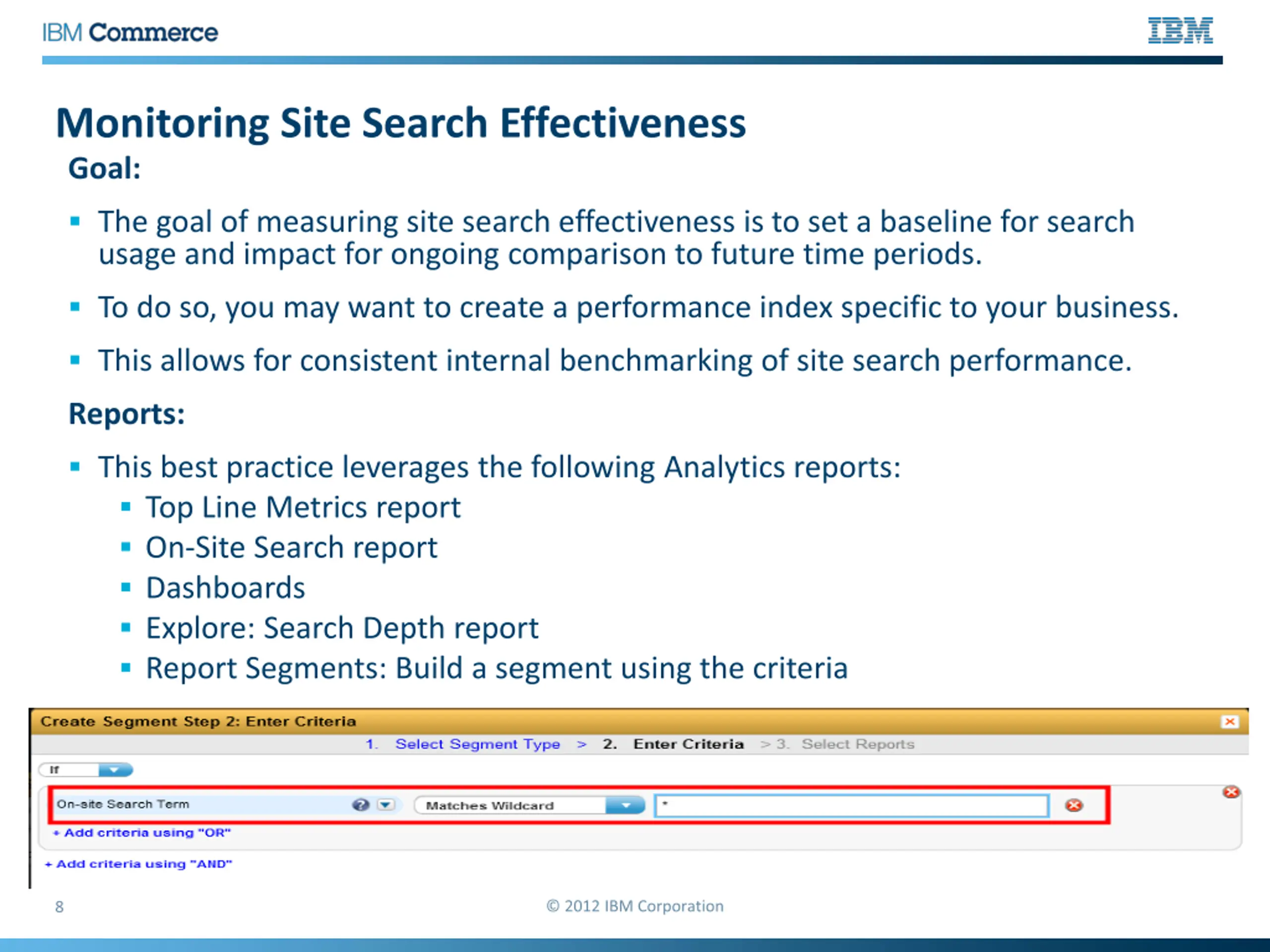 Monitoring Site Search Effectiveness Goal: The goal of measuring site search effectiveness is to set a baseline for search usage and impact for ongoing comparison to future time periods. To do so, you may want to create a performance index specific to your business. This allows for consistent internal benchmarking of site search performance. Reports: This best practice leverages the following Analytics reports: Top Line Metrics report On-Site Search report Dashboards Explore: Search Depth report Report Segments: Build a segment using the criteria