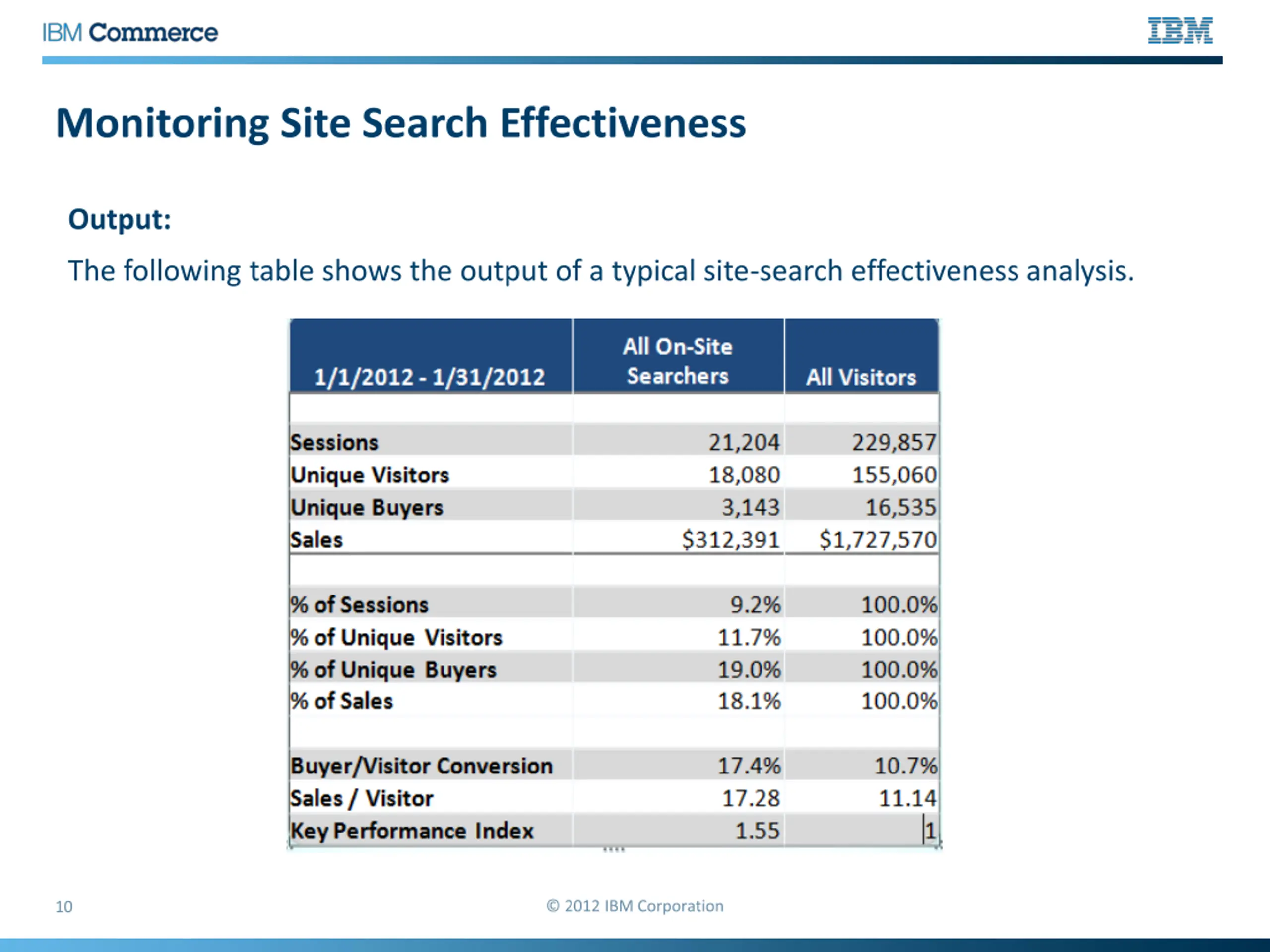 Monitoring Site Search Effectiveness Actions: Because this analysis focuses on delivering a baseline understanding of on- site search users, a majority of the insight is for use in comparison to future time periods. Changes in percentage of Visitors, Buyers, Sales resulting from search These metrics are used to understand the overall impact of changes to on-site search visibility, usability, and effectiveness. Changes in percentage of Sessions Using Search, percentage of Unique Visitors using search These metrics are used to understand impact of search visibility improvements or design integration. Changes in the Buyer/Visitor Conversion ratio These metrics are used to understand the impact of changes to search results relevance and presentation. Key Performance Index Analysts can set a performance index that is specific to their business. In this instance, the KPI is Sales per Visitor for All Searchers, divided by the same metric for All Visitors. This example shows that searchers deliver 55% more revenue per visitor than typical site users.