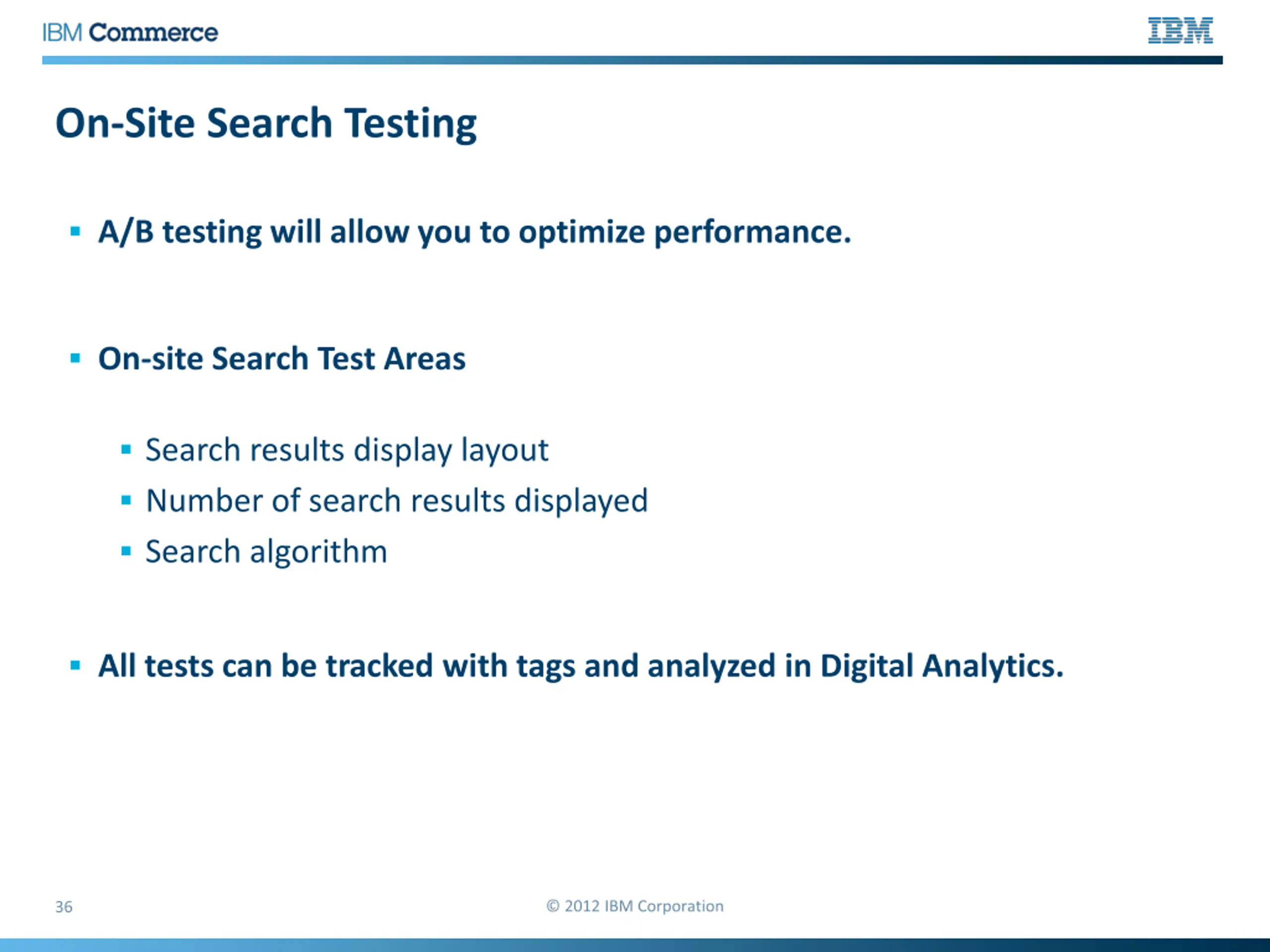 Common Client Concerns and Best Practices IBM Digital Analytics presents several best practices for increasing conversion with on-site search, including: Monitoring Site Search Effectiveness Create a baseline of current usage and value for comparison to future effectiveness after implementing changes. Reducing Unsuccessful Queries Analyze common searches that return no results, to identify opportunities to increase conversion. Increasing Results Relevance Analyze the relevance of results for top searches, to identify opportunities to increase conversion. Benchmarking Site Search Performance Understand how your search effectiveness compares to industry peers.
