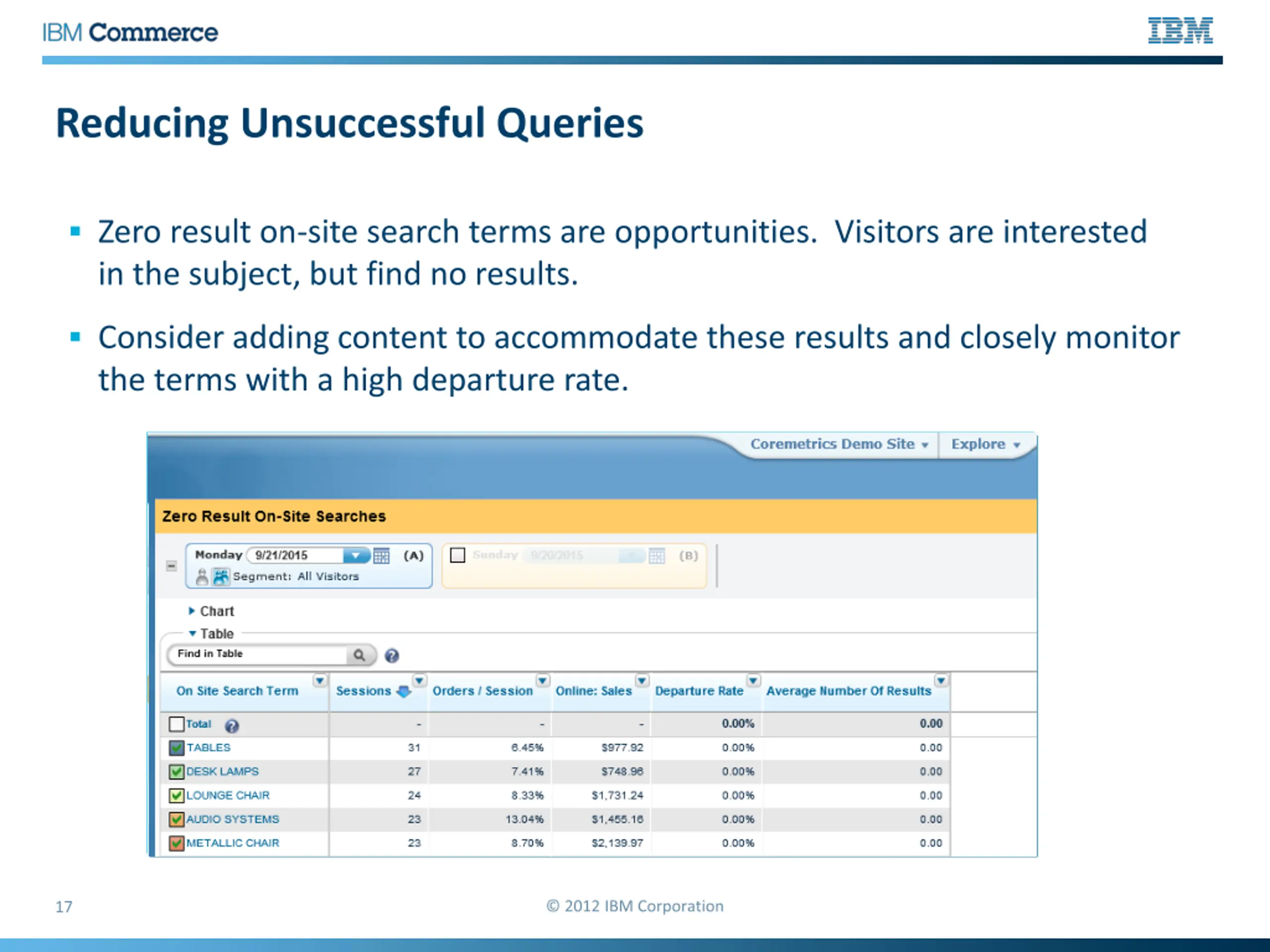 Reducing Unsuccessful Queries Zero result on-site search terms are opportunities. Visitors are interested in the subject, but find no results. Consider adding content to accommodate these results and closely monitor the terms with a high departure rate.