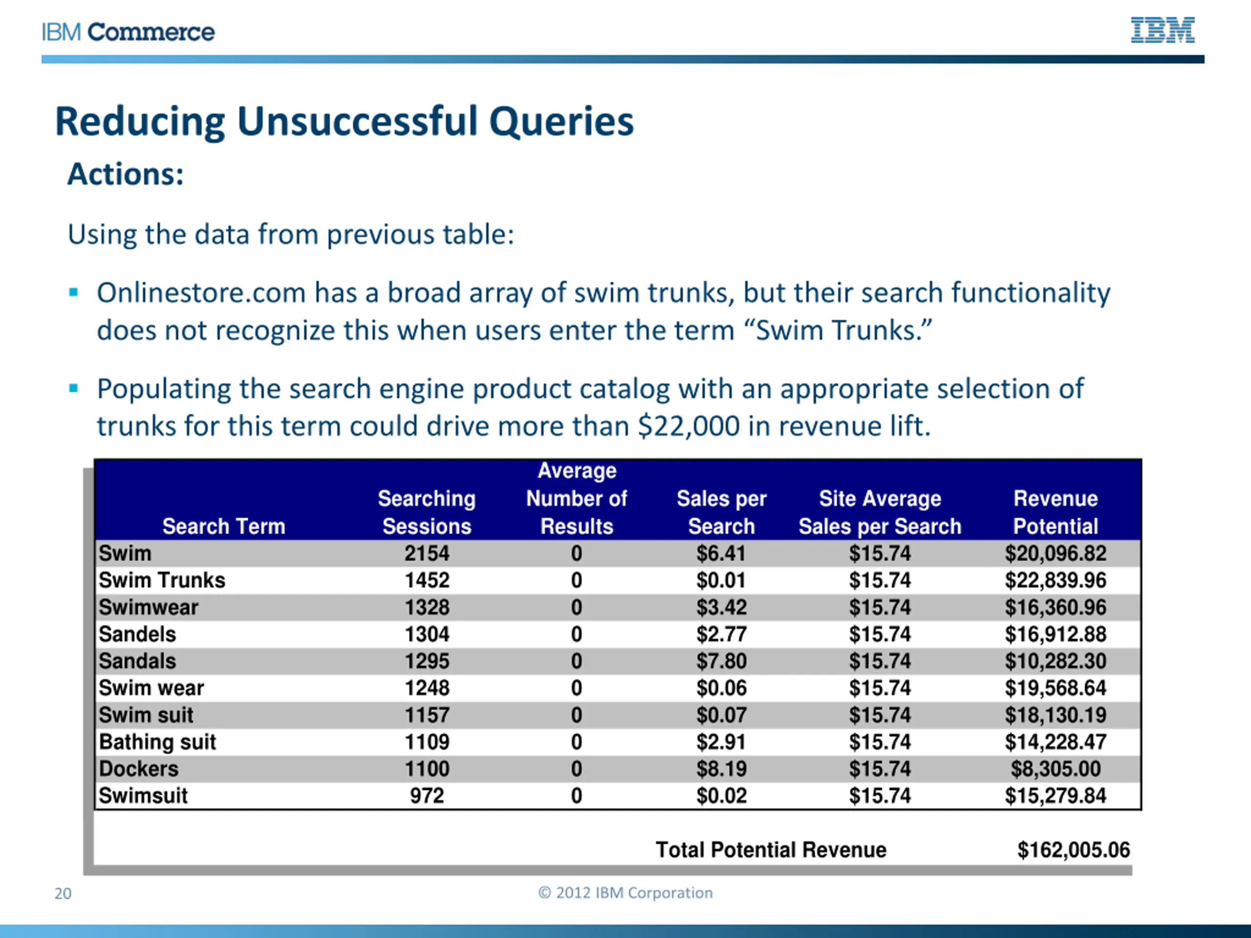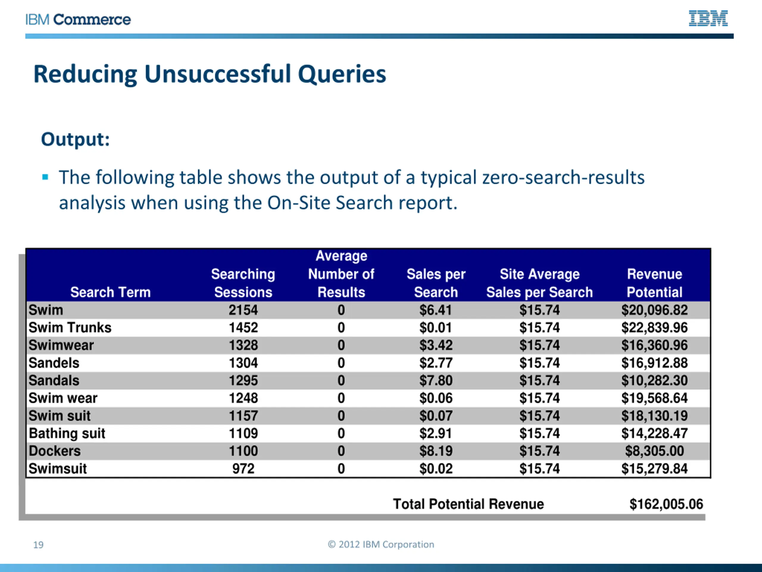 Reducing Unsuccessful Queries Output: The following table shows the output of a typical zero-search-results analysis when using the On-Site Search report. Average Number of Results 0 0 0 0 0 0 0 0 0 0 Searching Sessions 2154 1452 1328 1304 1295 1248 1157 1109 1100 972 Sales per Search $6.41 $0.01 $3.42 $2.77 $7.80 $0.06 $0.07 $2.91 $8.19 $0.02 Site Average Sales per Search $15.74 $15.74 $15.74 $15.74 $15.74 $15.74 $15.74 $15.74 $15.74 $15.74 Revenue Potential $20,096.82 $22,839.96 $16,360.96 $16,912.88 $10,282.30 $19,568.64 $18,130.19 $14,228.47 $8,305.00 $15,279.84 Search Term Swim Swim Trunks Swimwear Sandels Sandals Swim wear Swim suit Bathing suit Dockers Swimsuit Total Potential Revenue $162,005.06