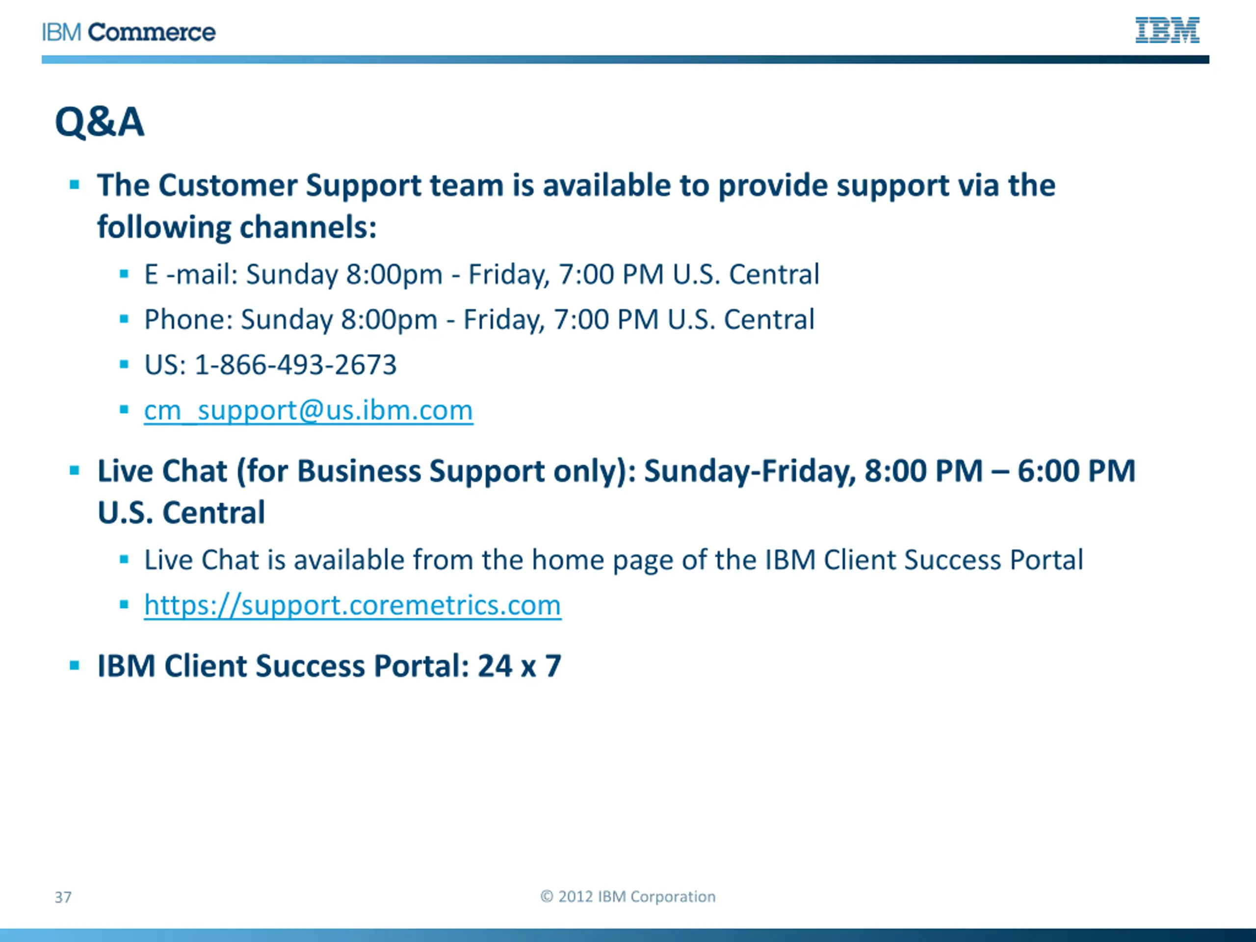 Q&A The Customer Support team is available to provide support via the following channels: E -mail: Sunday 8:00pm - Friday, 7:00 PM U.S. Central Phone: Sunday 8:00pm - Friday, 7:00 PM U.S. Central US: 1-866-493-2673 cm_support@us.ibm.com Live Chat (for Business Support only): Sunday-Friday, 8:00 PM 6:00 PM U.S. Central Live Chat is available from the home page of the IBM Client Success Portal https://support.coremetrics.com IBM Client Success Portal: 24 x 7