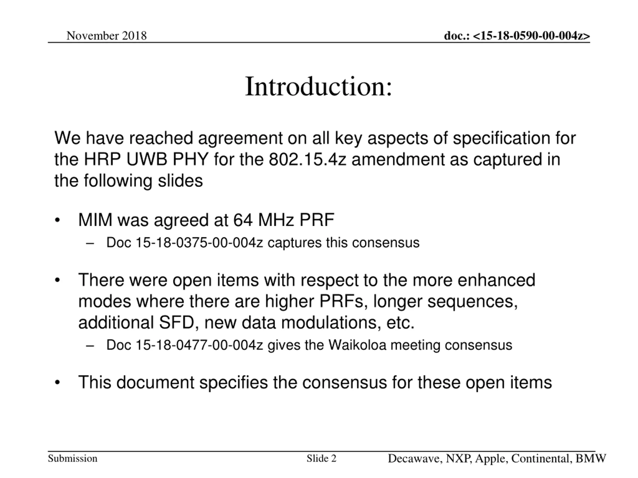 doc.: <15-18-0590-00-004z> November 2018 Introduction: We have reached agreement on all key aspects of specification for the HRP UWB PHY for the 802.15.4z amendment as captured in the following slides MIM was agreed at 64 MHz PRF Doc 15-18-0375-00-004z captures this consensus There were open items with respect to the more enhanced modes where there are higher PRFs, longer sequences, additional SFD, new data modulations, etc. Doc 15-18-0477-00-004z gives the Waikoloa meeting consensus This document specifies the consensus for these open items Decawave, NXP, Apple, Continental, BMW Submission Slide 2