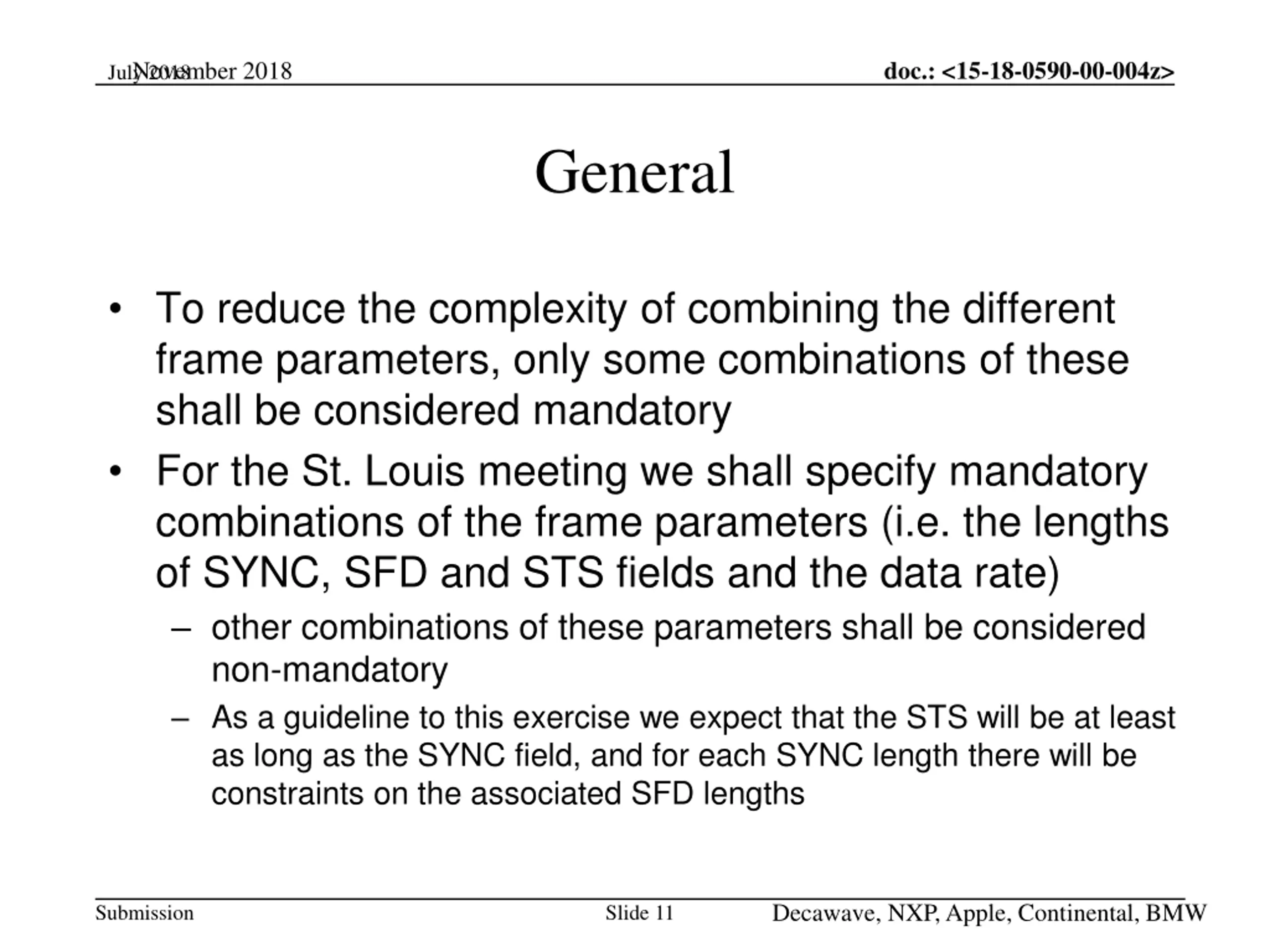 doc.: <15-18-0590-00-004z> November 2018 July 2018 General To reduce the complexity of combining the different frame parameters, only some combinations of these shall be considered mandatory For the St. Louis meeting we shall specify mandatory combinations of the frame parameters (i.e. the lengths of SYNC, SFD and STS fields and the data rate) other combinations of these parameters shall be considered non-mandatory As a guideline to this exercise we expect that the STS will be at least as long as the SYNC field, and for each SYNC length there will be constraints on the associated SFD lengths Decawave, NXP, Apple, Continental, BMW Submission Slide 11